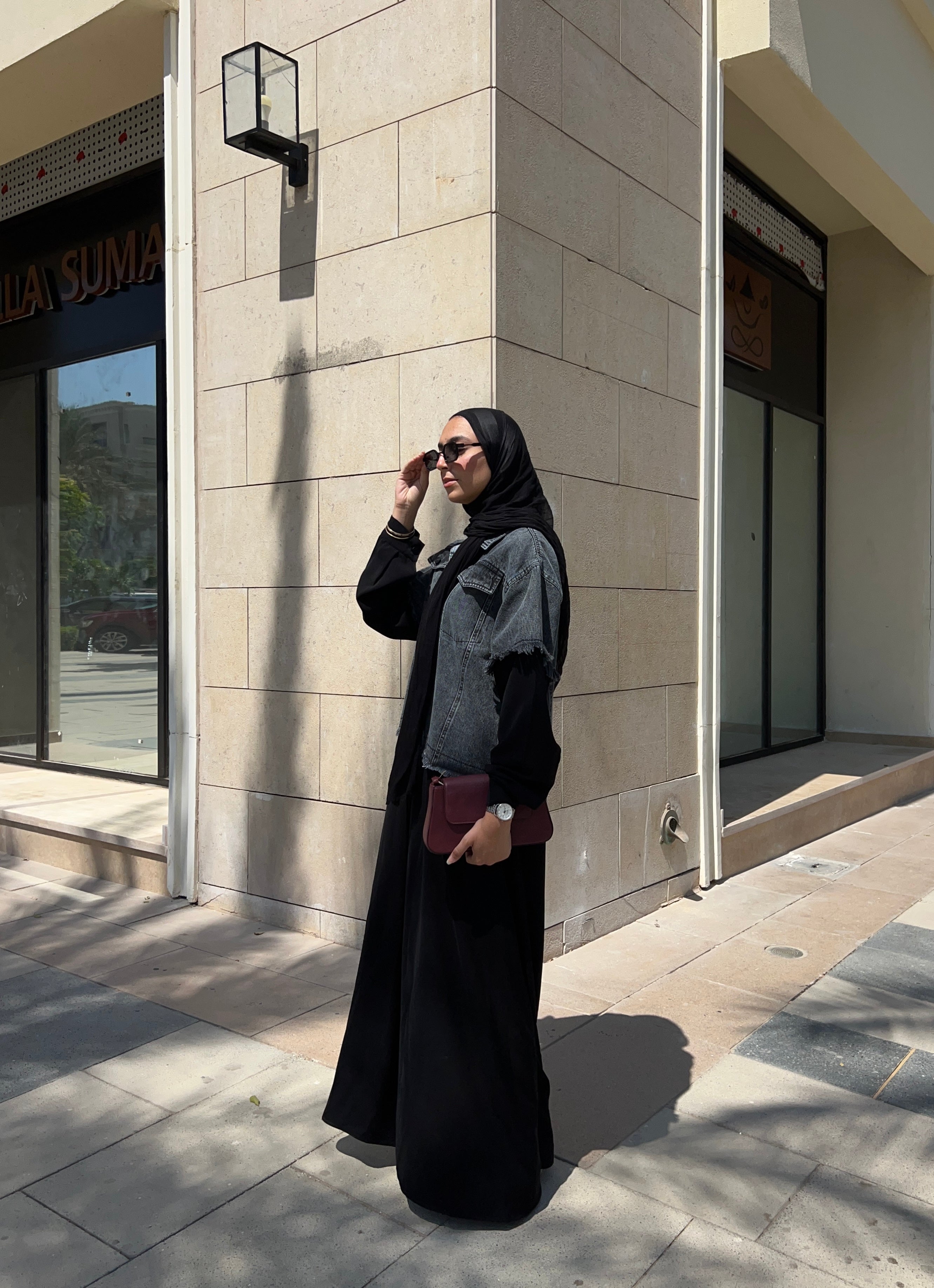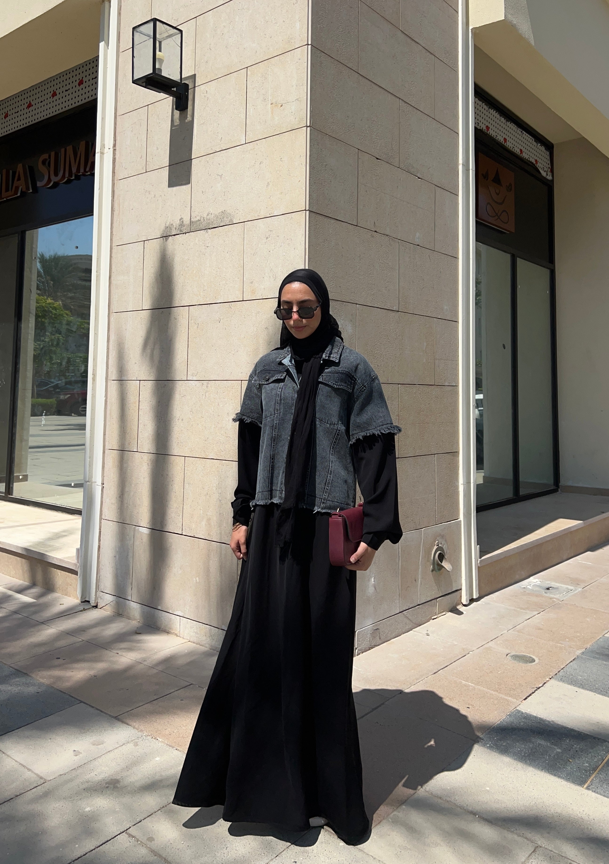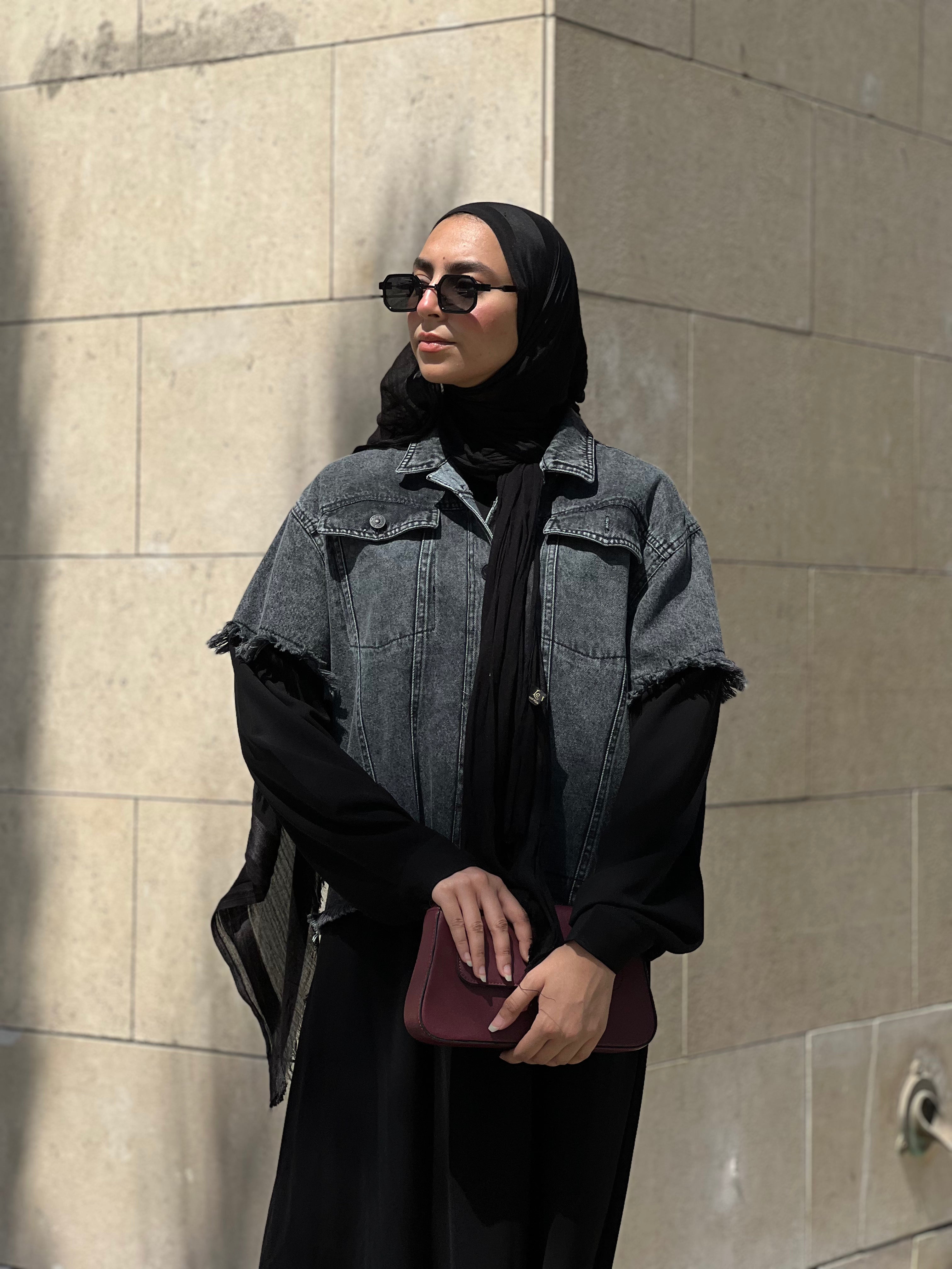 Abaya with a denim-inspired jacket top and soft crepe finish عباية بتصميم جاكت دنيم من الأعلى وكريب انسيابي لباقي العباية (قطعة واحدة)