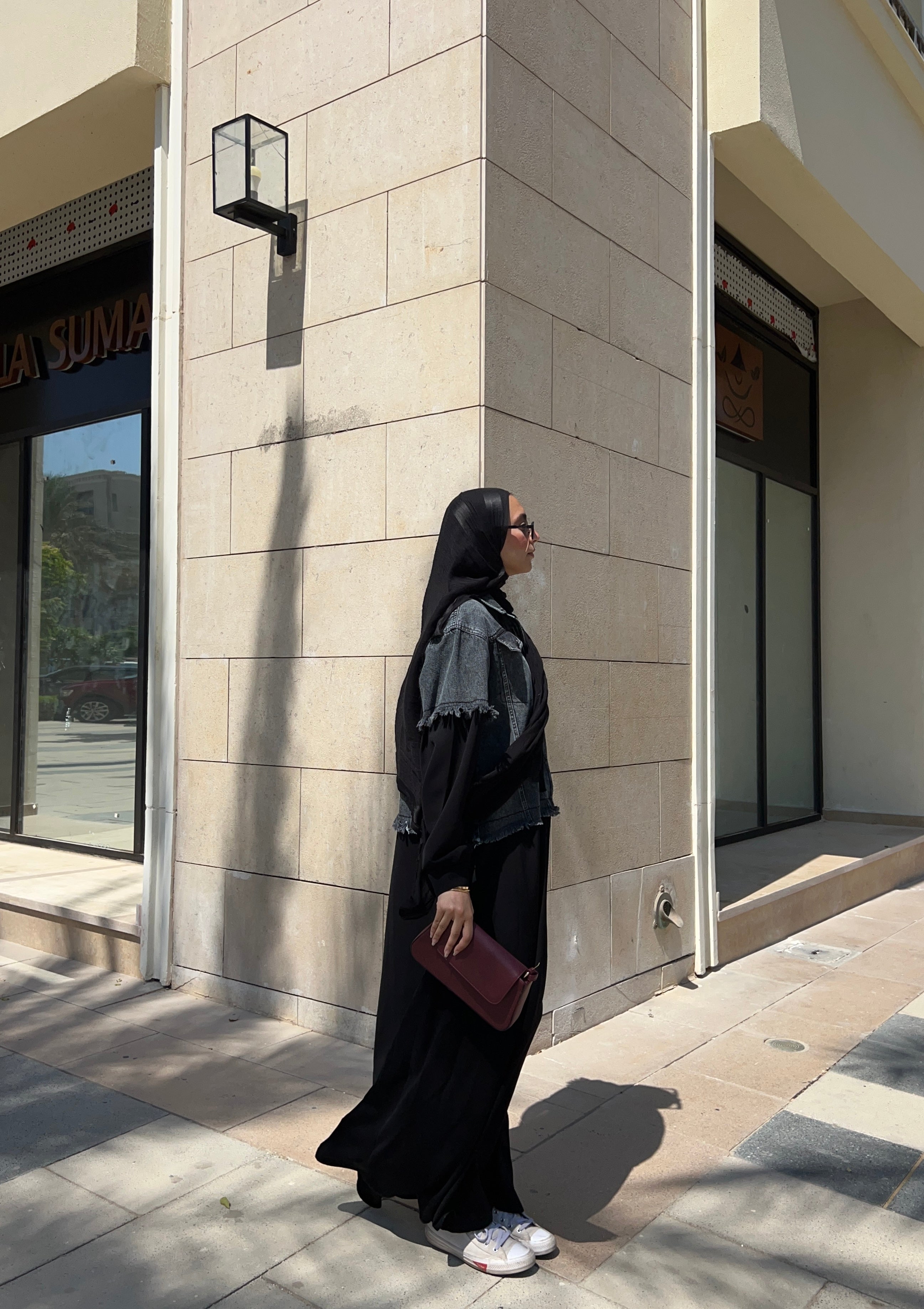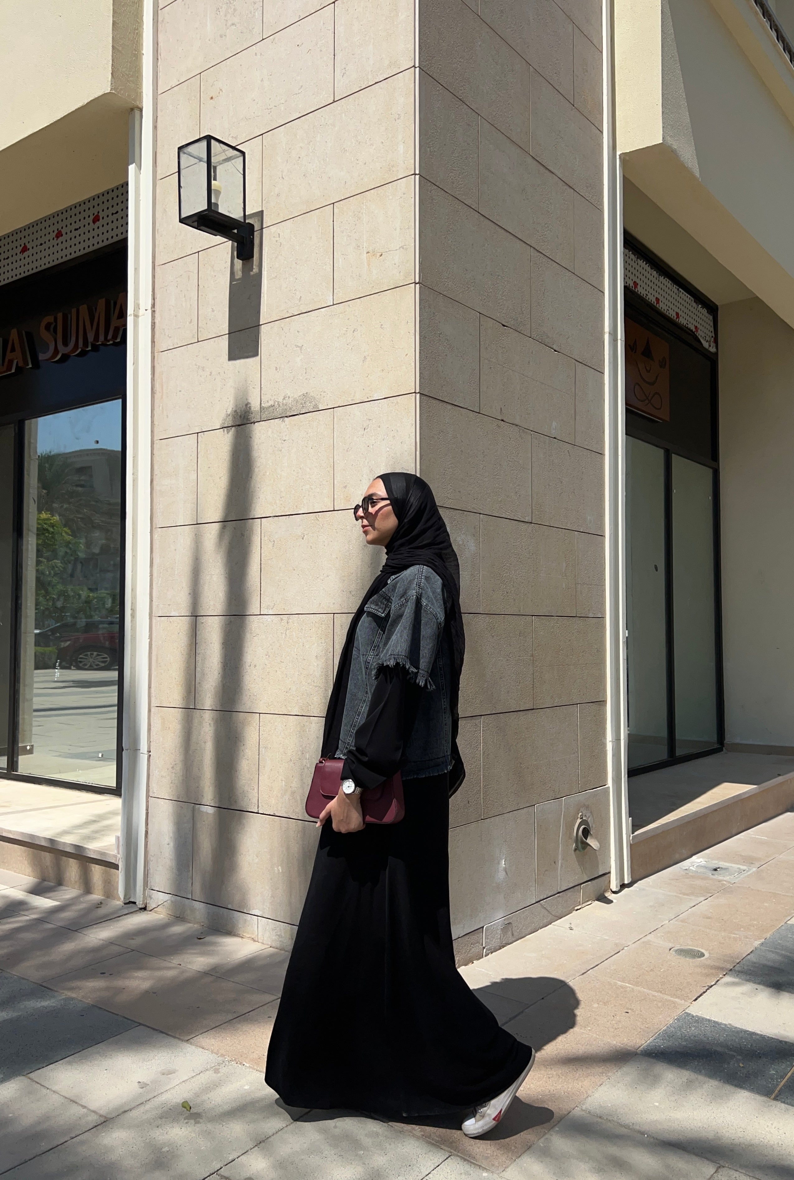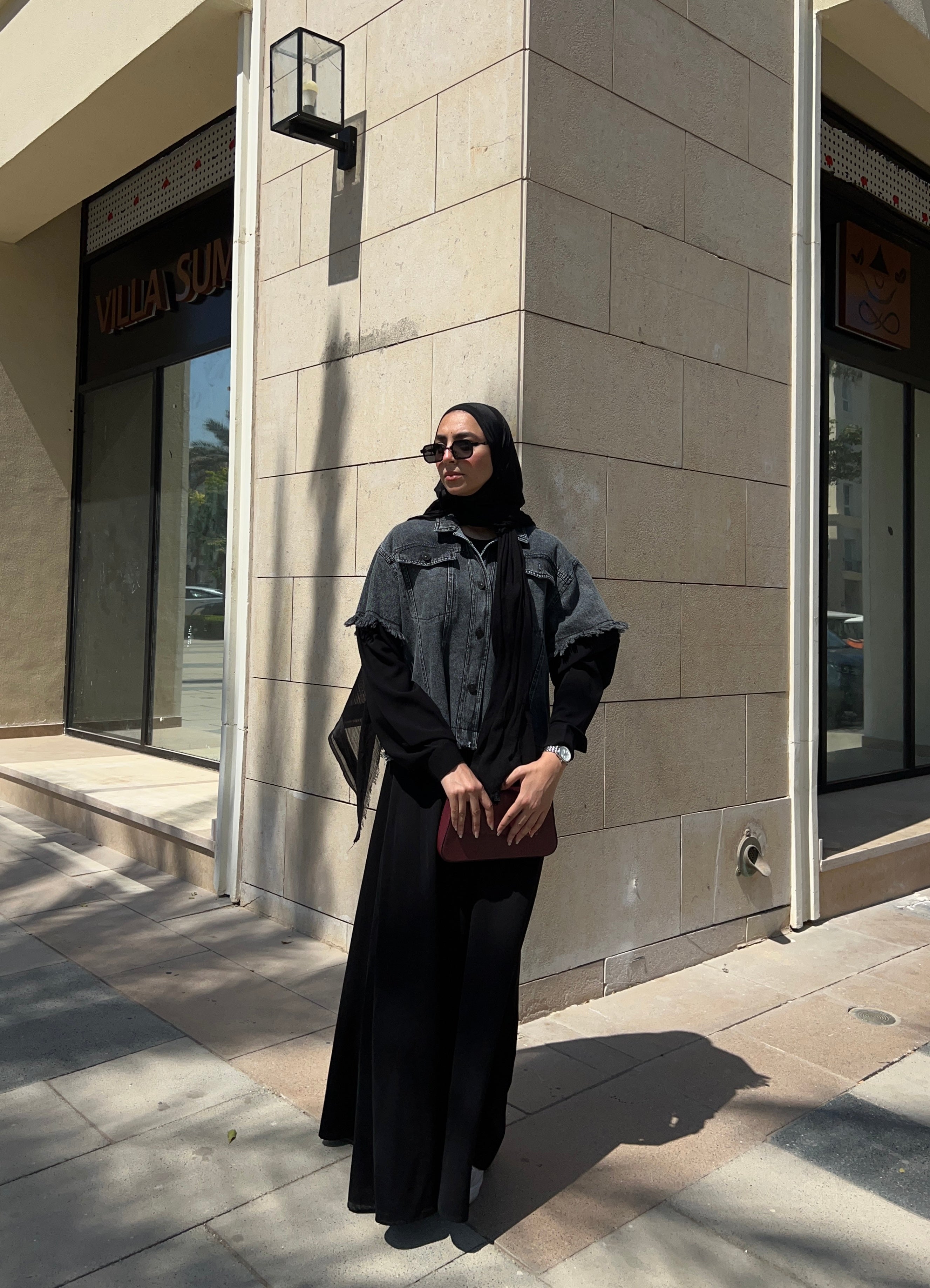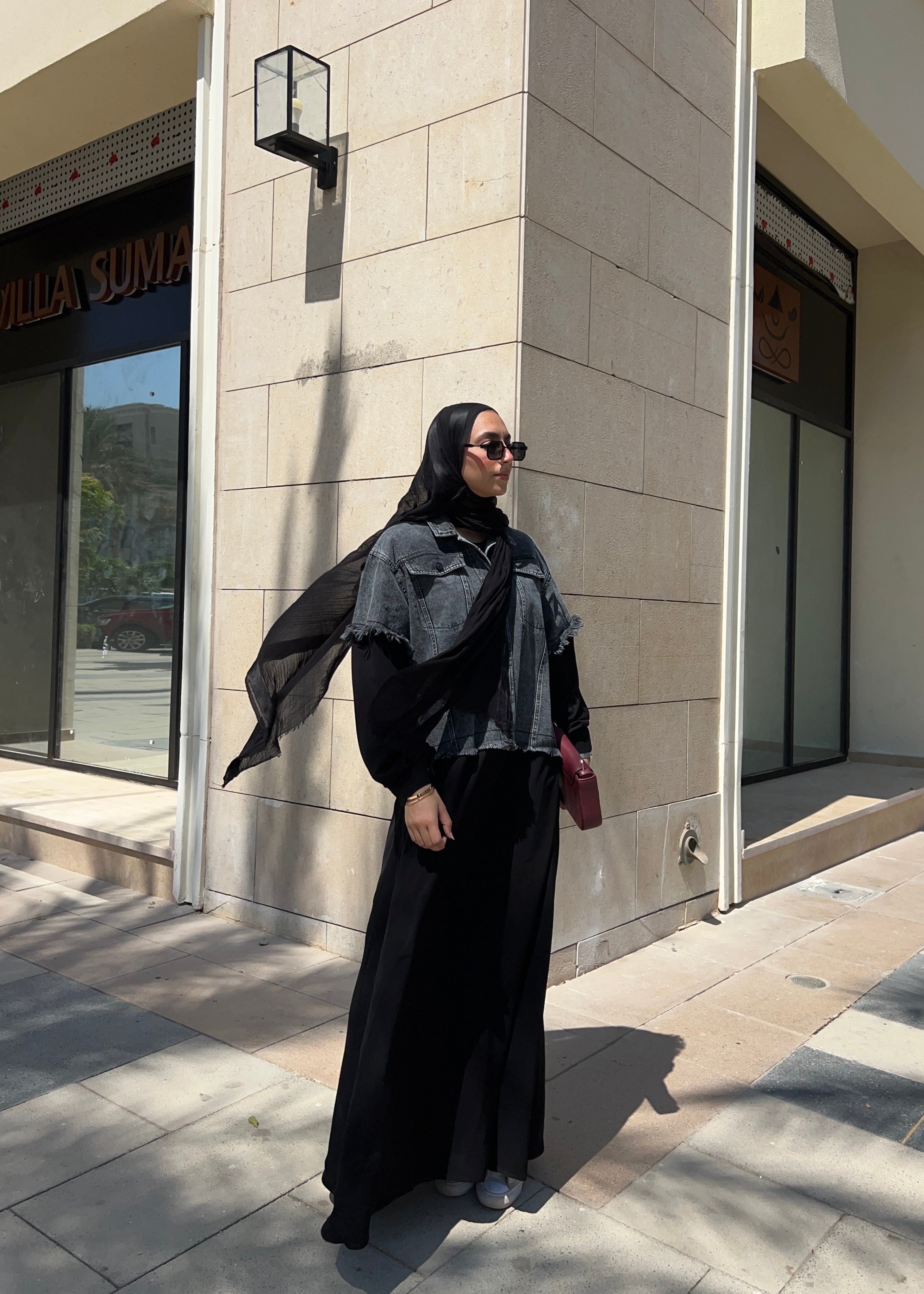 Abaya with a denim-inspired jacket top and soft crepe finish عباية بتصميم جاكت دنيم من الأعلى وكريب انسيابي لباقي العباية (قطعة واحدة)