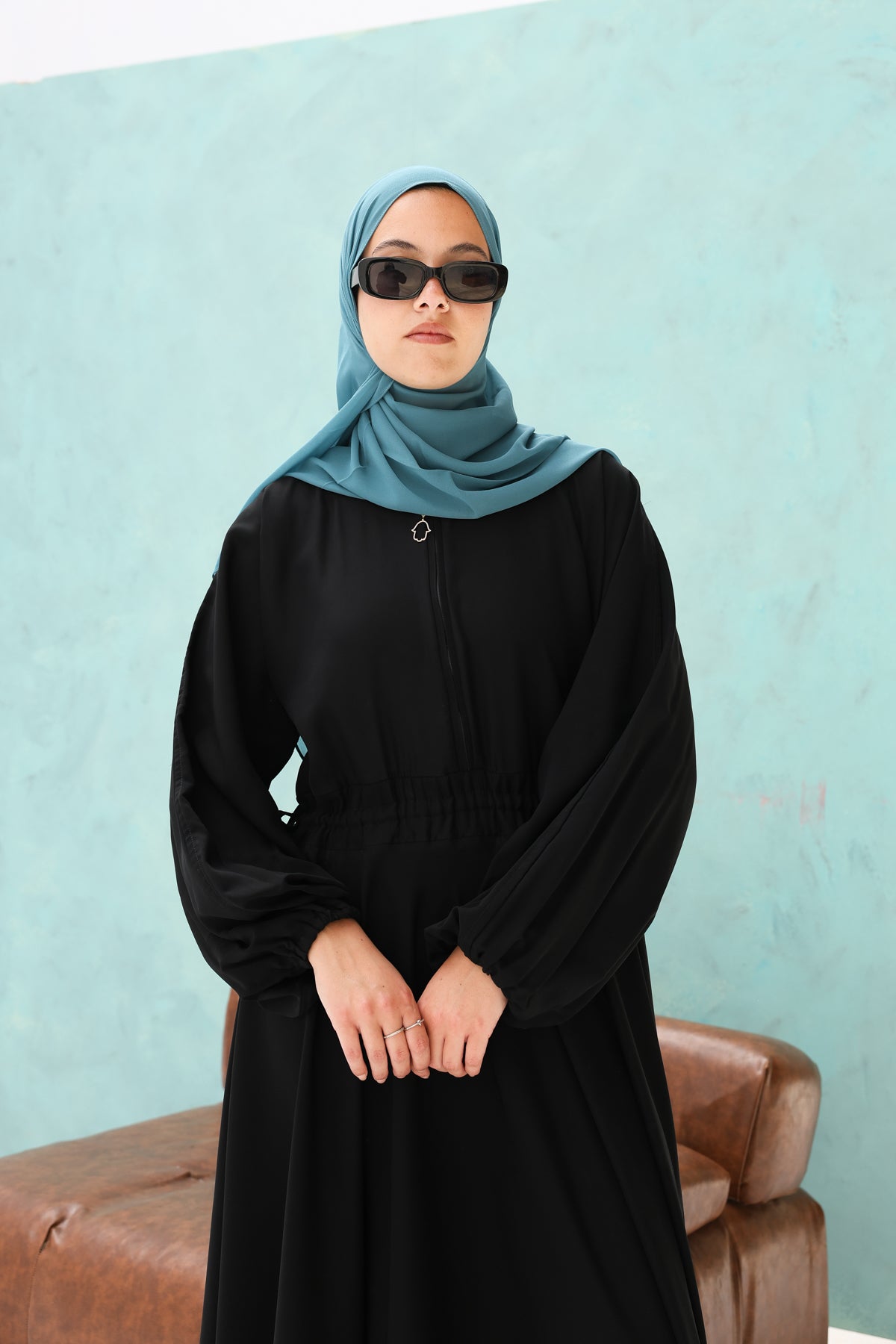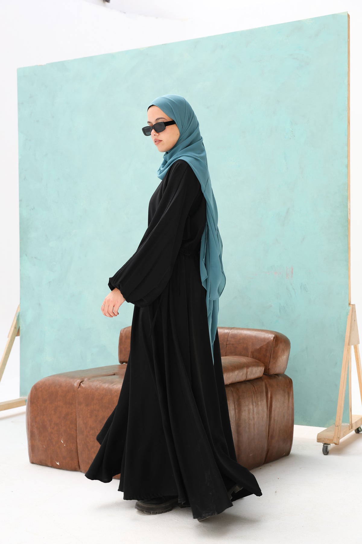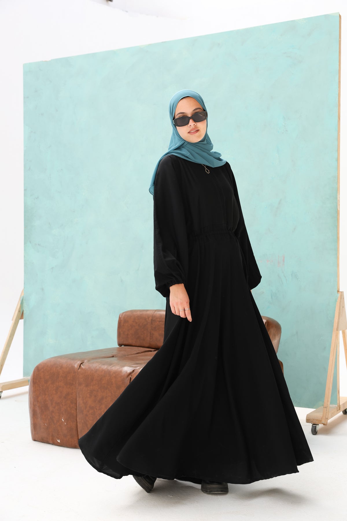 Premium silk abaya with a double cloche cut and a clean hidden front zipper.