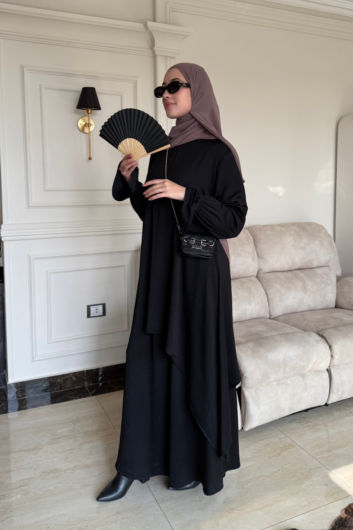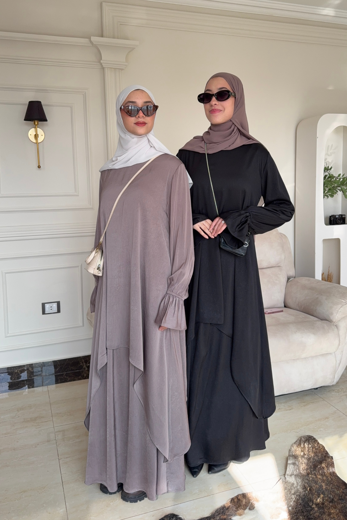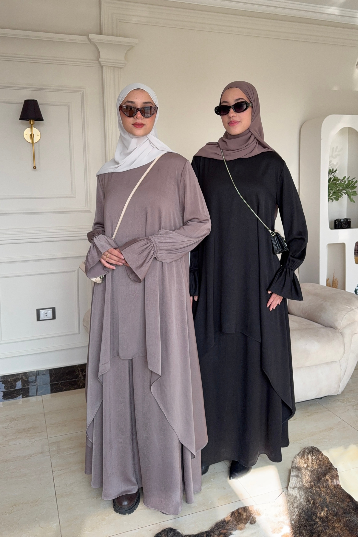 سيت أنيق يجمع بين البساطة والفخامة الراقية، مكون من تونيك وجيب مصنوع من قماش انسيابي بلمعة ناعمة وهادئة، مع قصّة محتشمة عصرية تناسب المناسبات الراقية