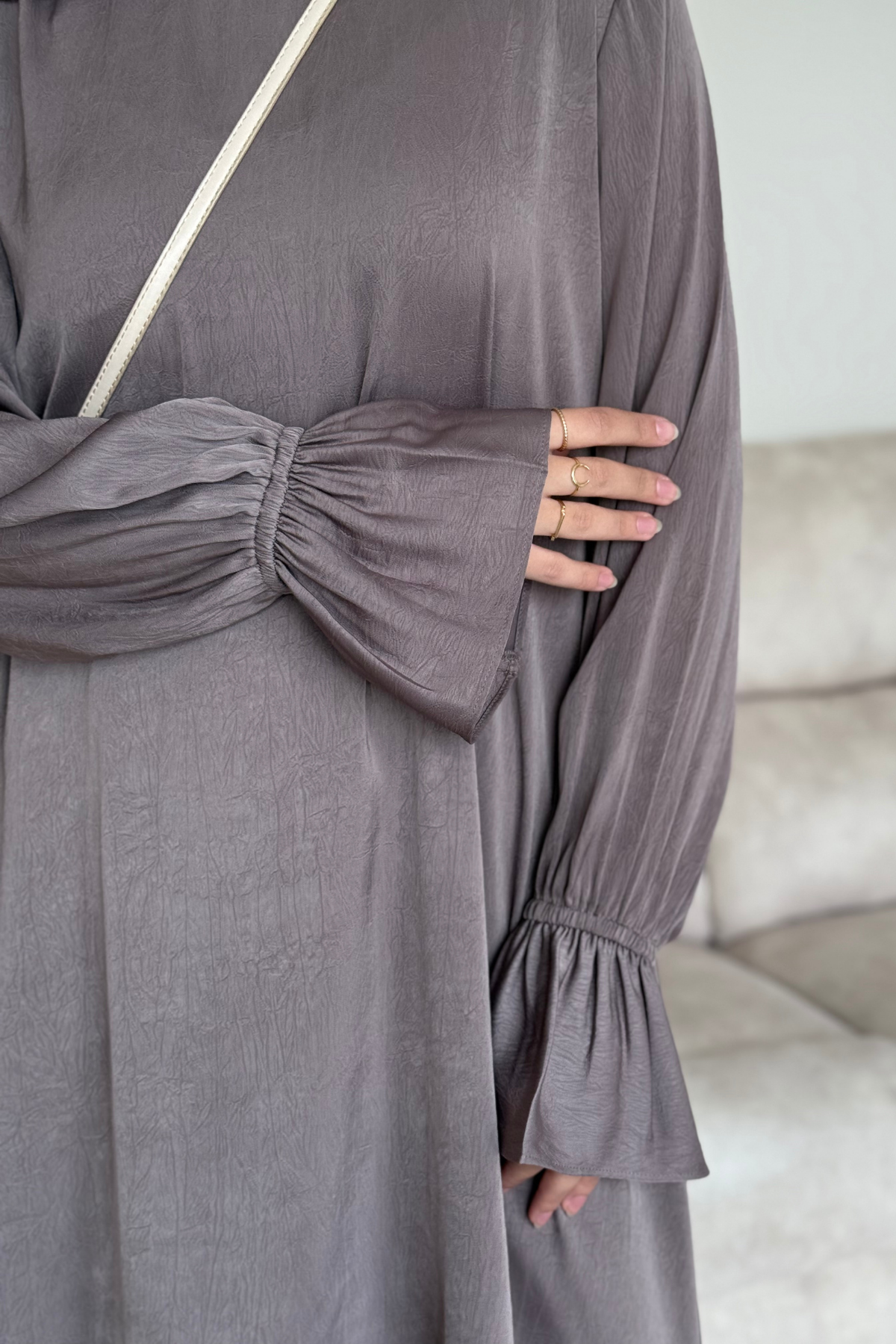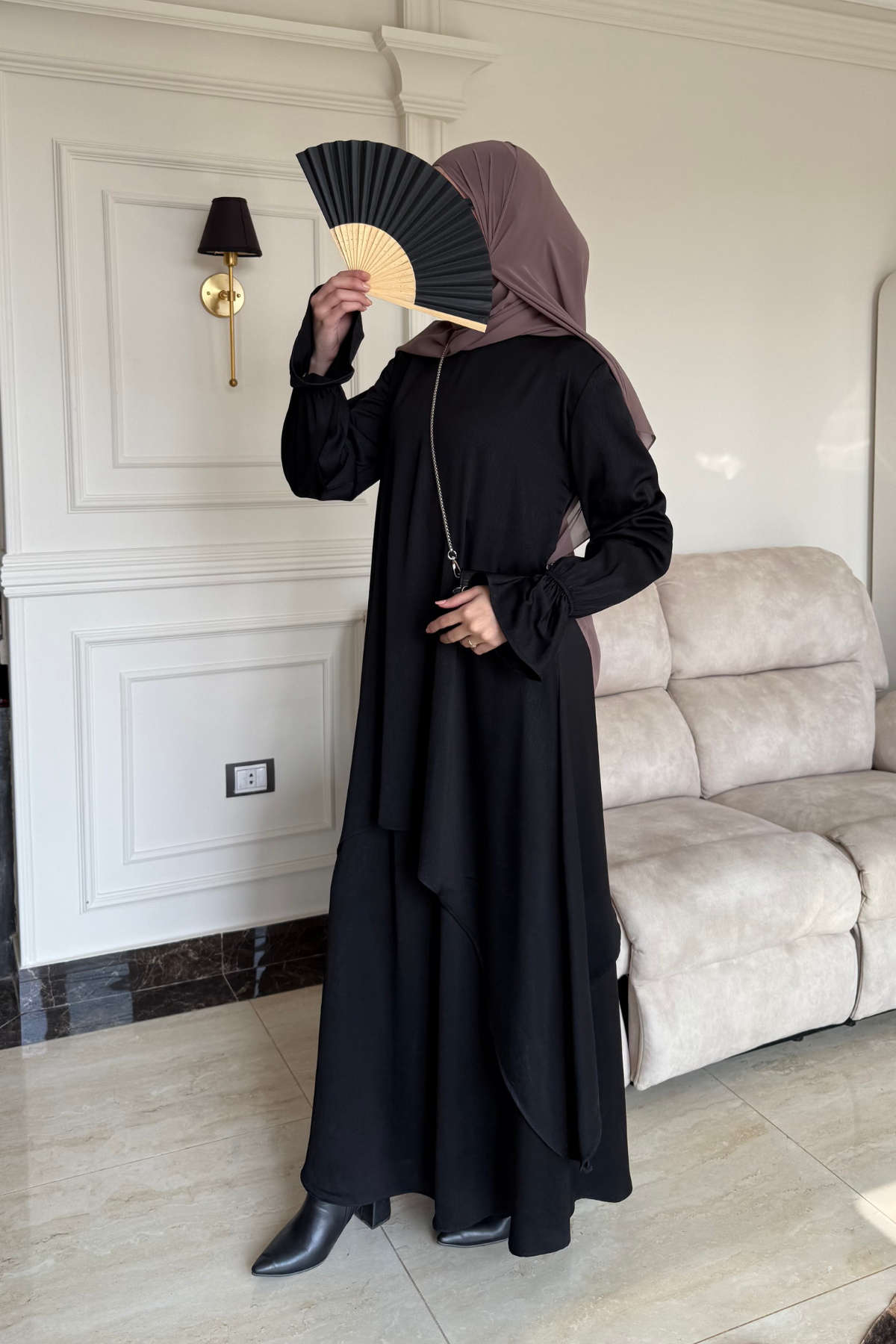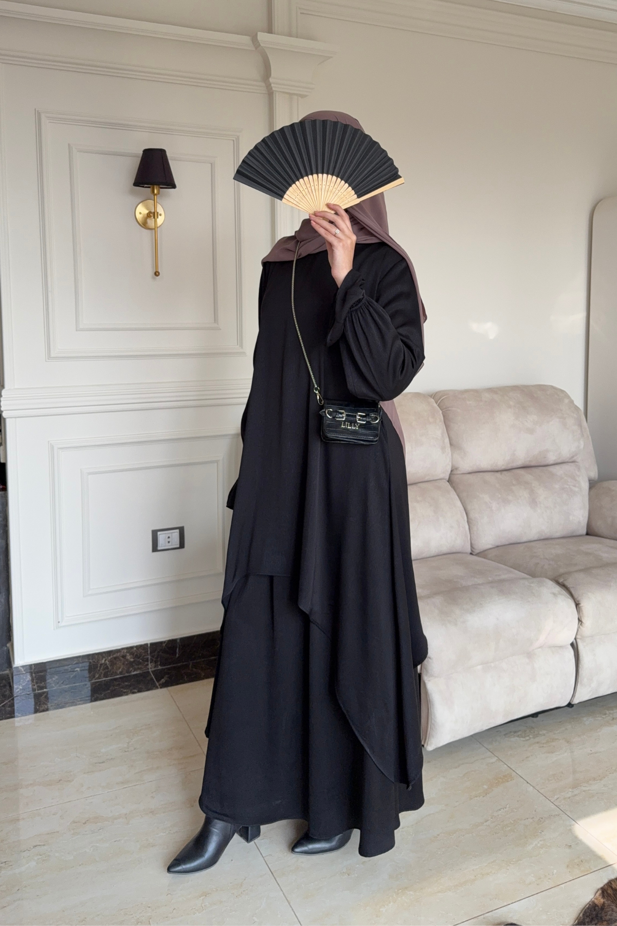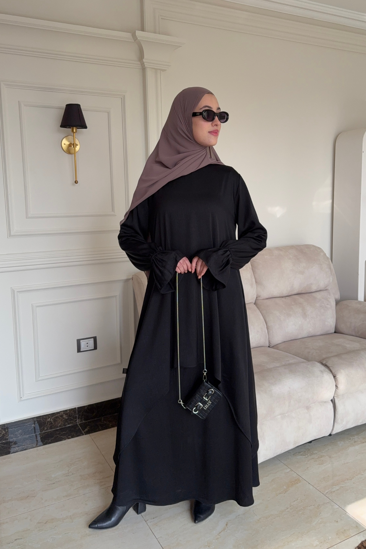 سيت أنيق يجمع بين البساطة والفخامة الراقية، مكون من تونيك وجيب مصنوع من قماش انسيابي بلمعة ناعمة وهادئة، مع قصّة محتشمة عصرية تناسب المناسبات الراقية
