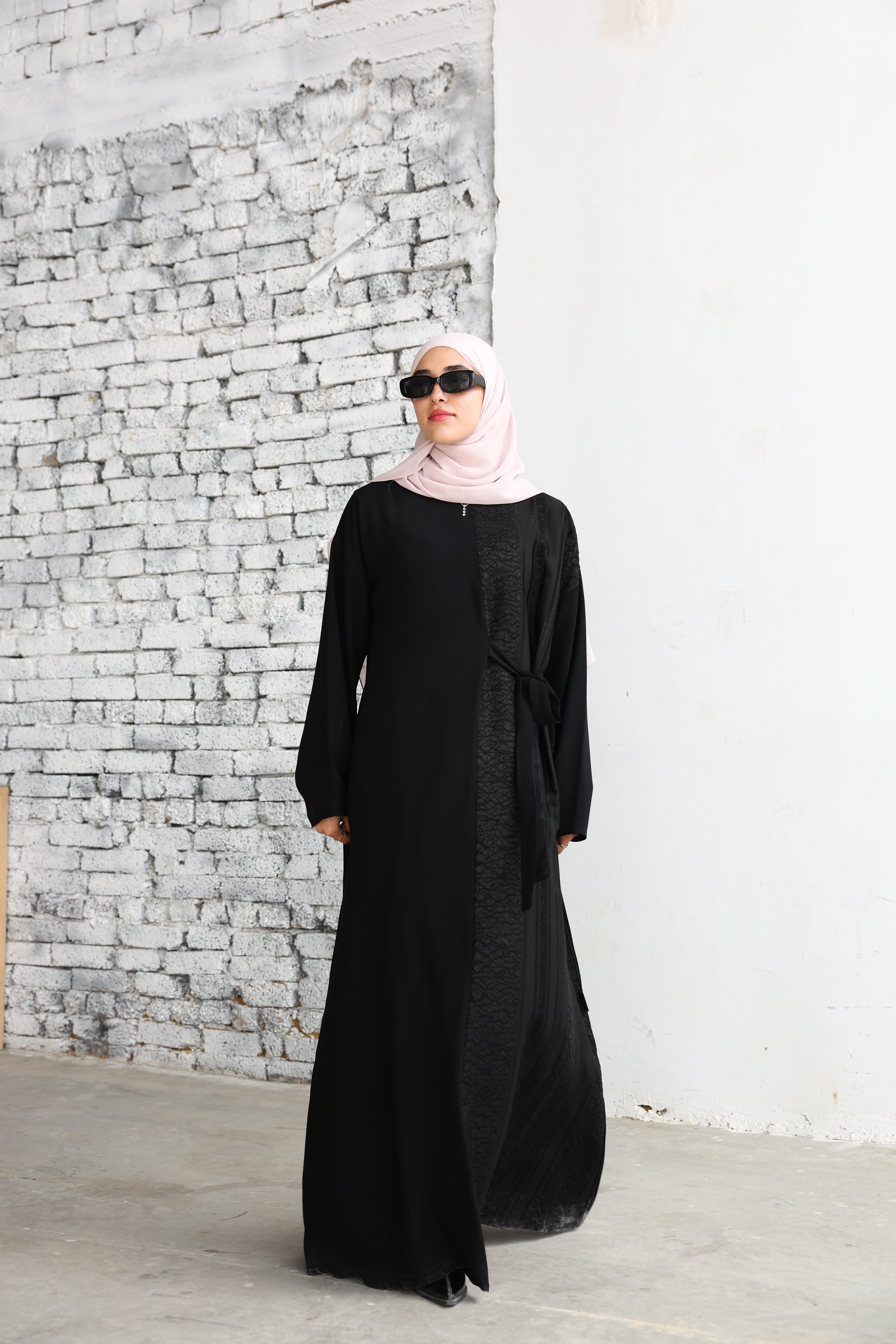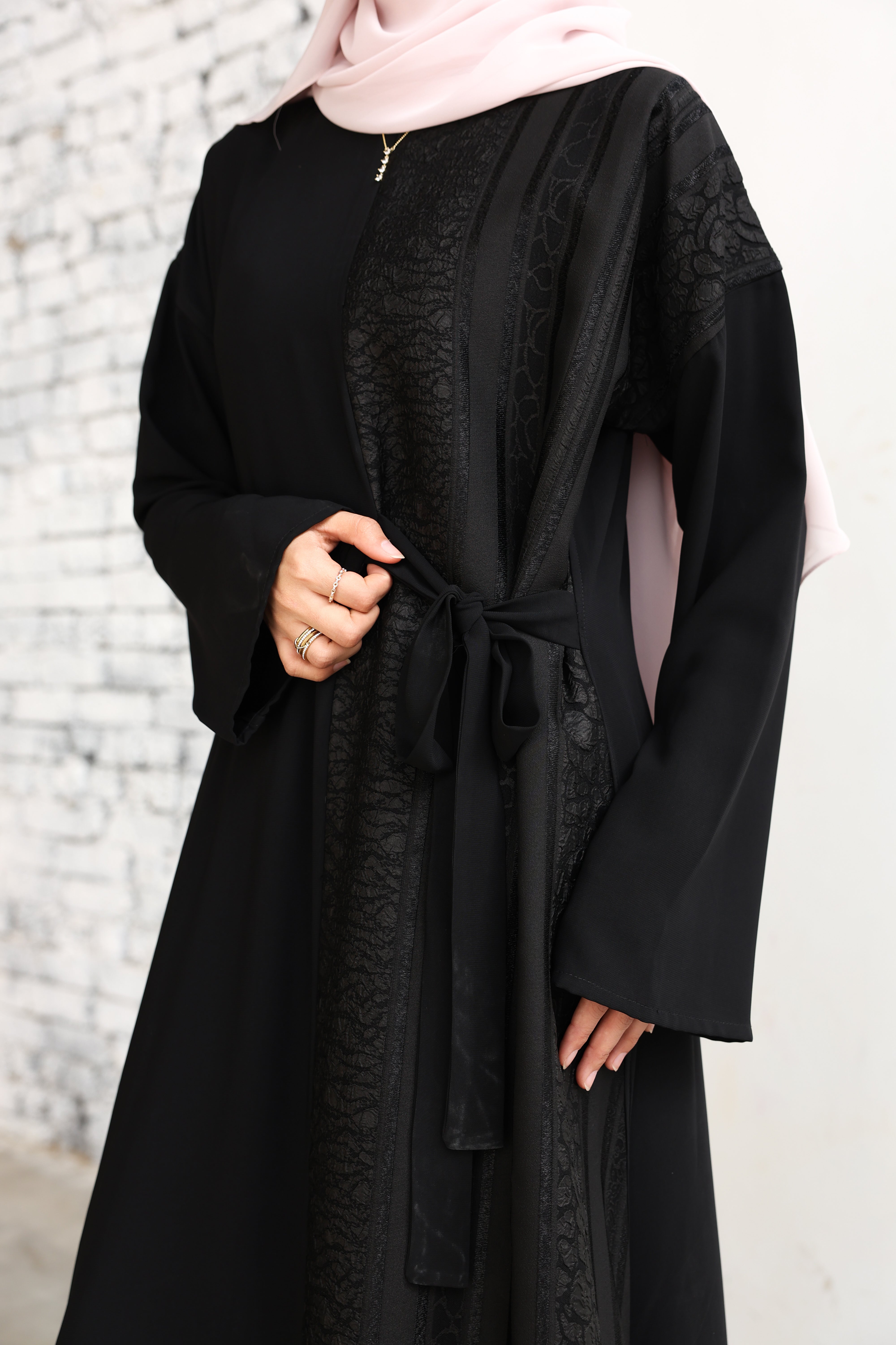 عباية سوداء بتصميم راقٍ وجودة عالية بمزيج من قماش الجاكار بنقشة راقية علي كريب انسيابي مع خياطة إنجليزي نظيفة من الداخل