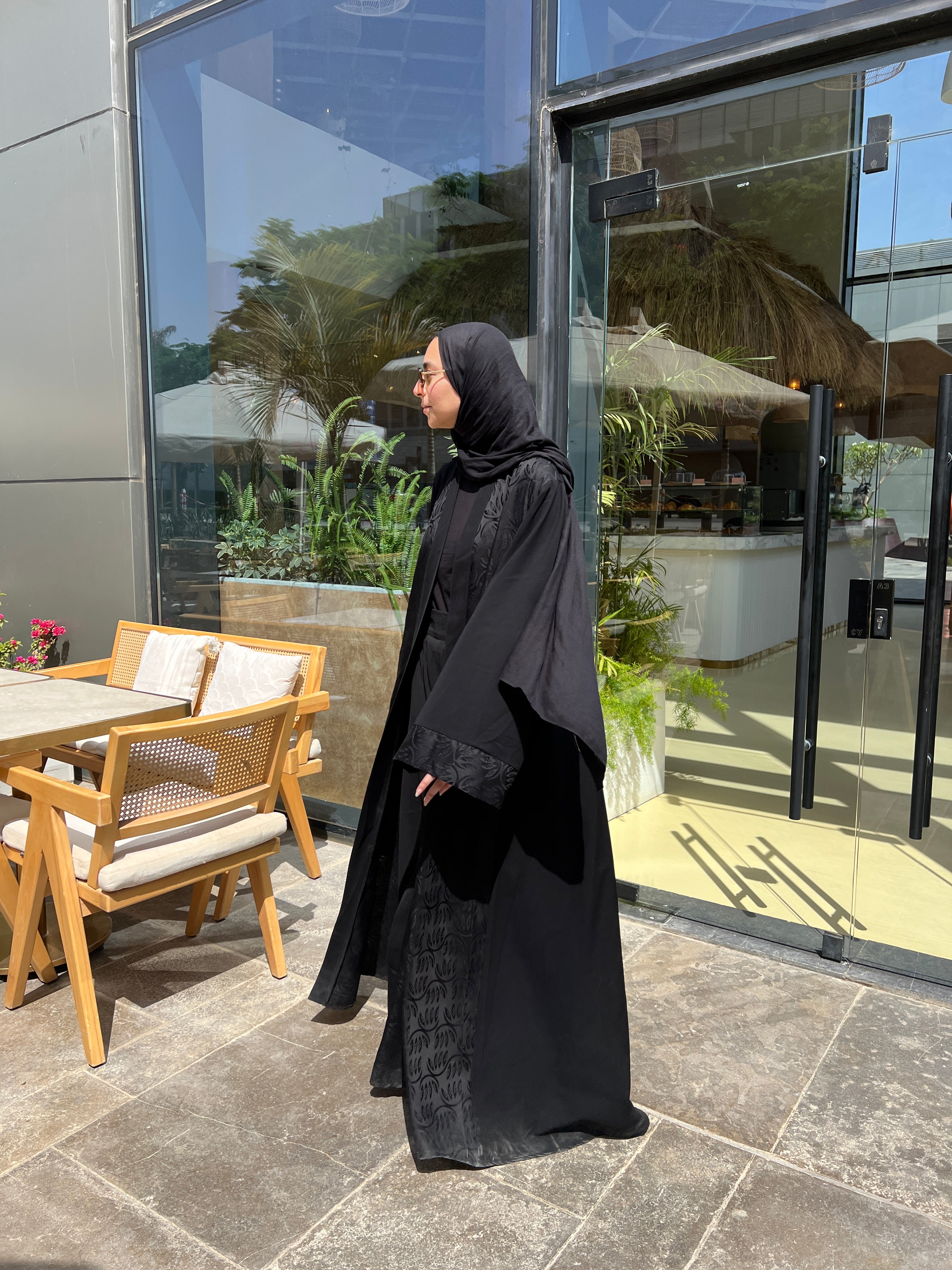 عباية أنيقة مفتوحة بنقوش بارزة ومزيج من الكريب والحرير الجاكار بتصميم مميز ورقيق   An elegant open abaya with embossed patterns and luxurious details, mix between premium crepe and jakar material .