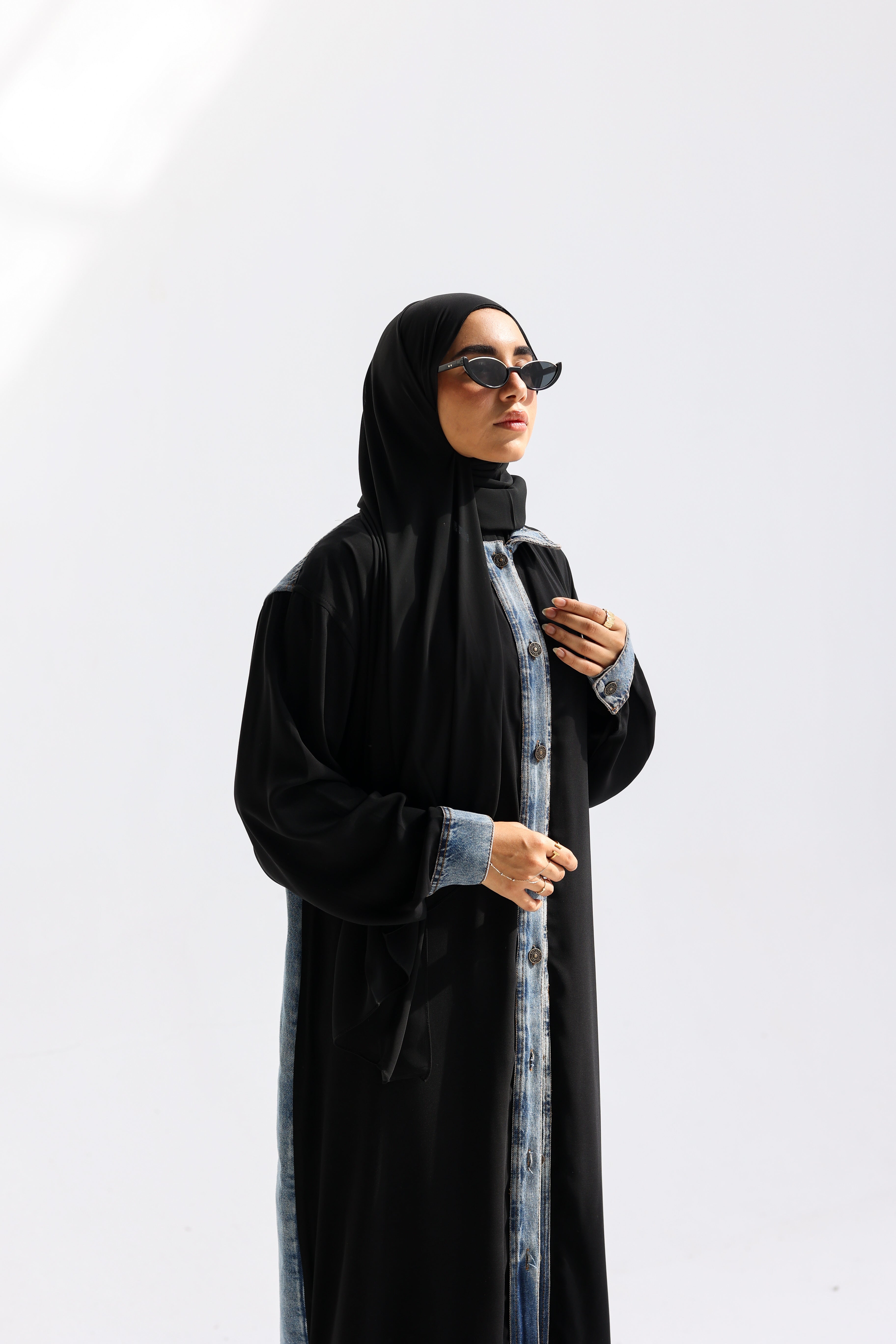 New denim abaya jacket made from breathable denim and crepe with denim details and premium denim accessories