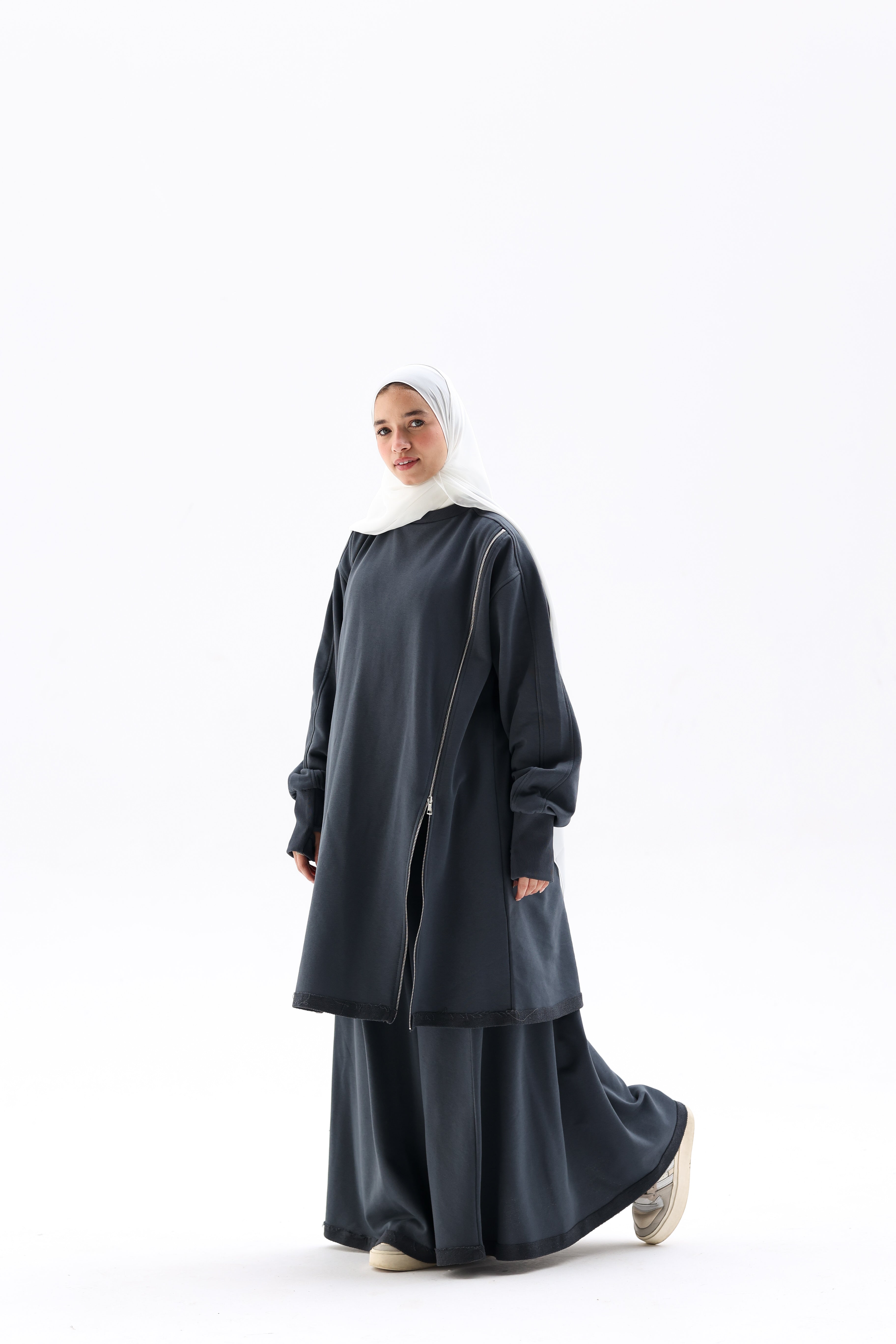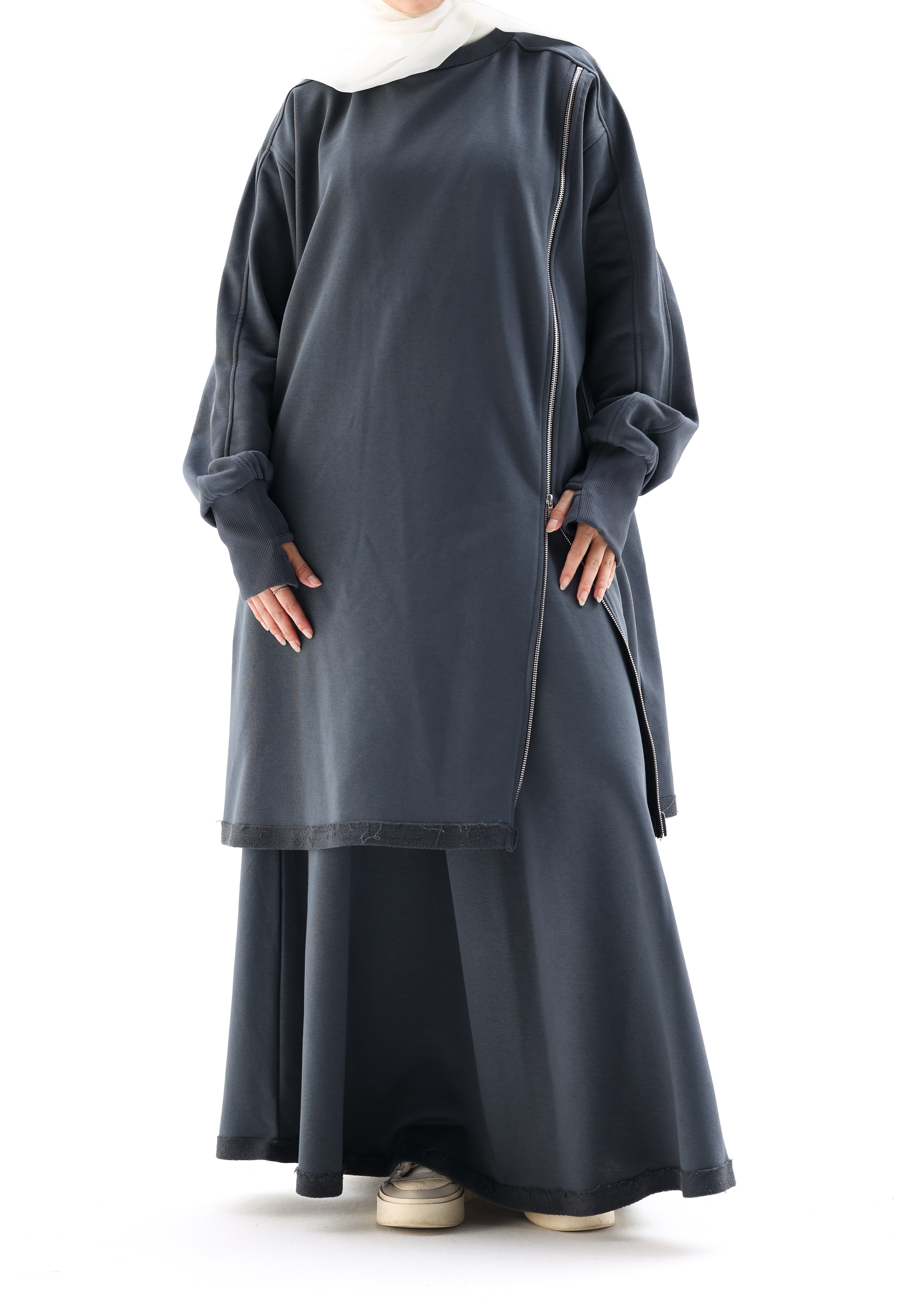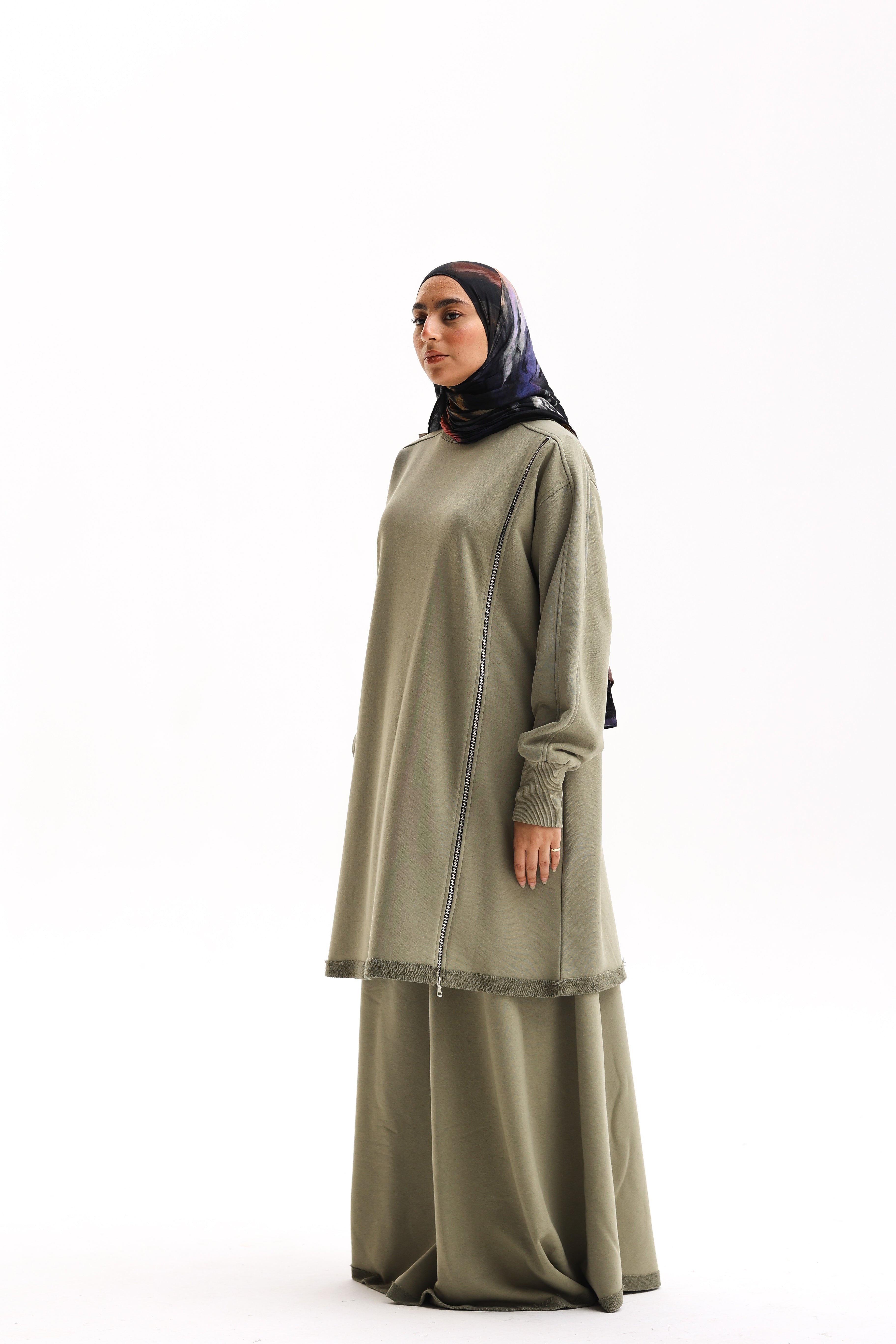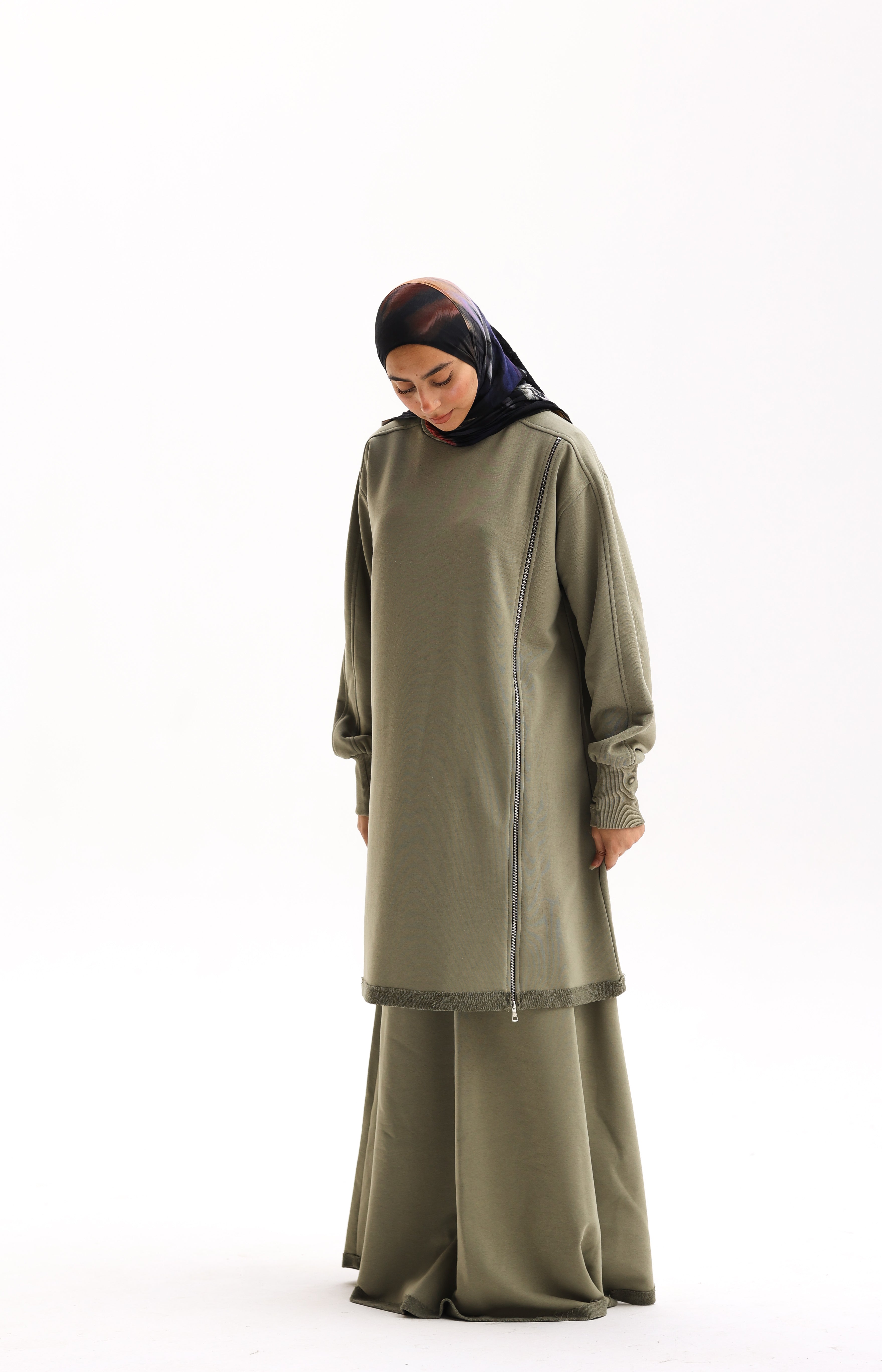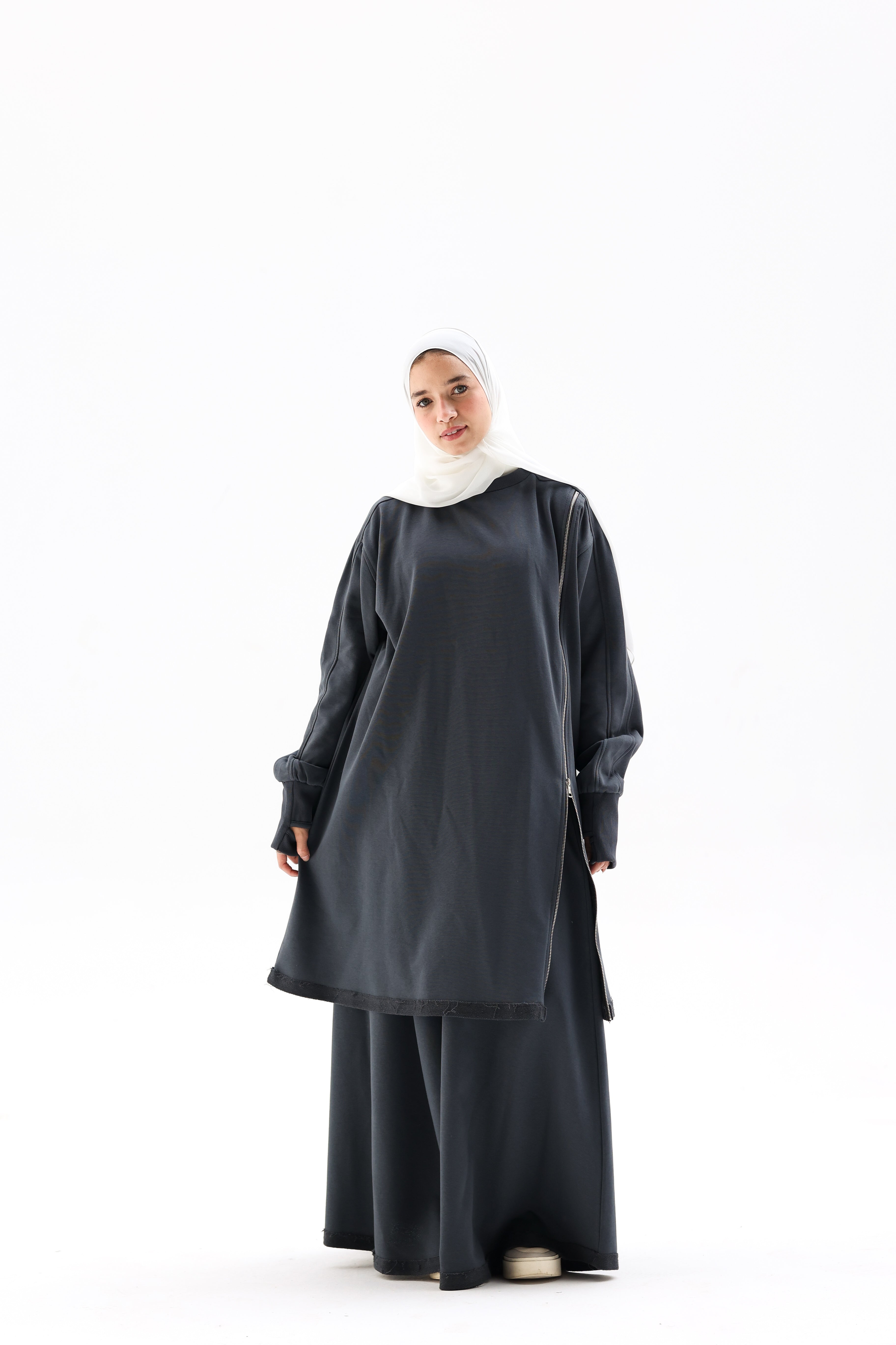 طقم شتوي مكوّن من تونيك بسوستة جانبية وجيب واسع، من خامة ميلتون ناعمة ودافئة. Two-piece winter set featuring a side-zip tunic and wide skirt in soft melton fabric.