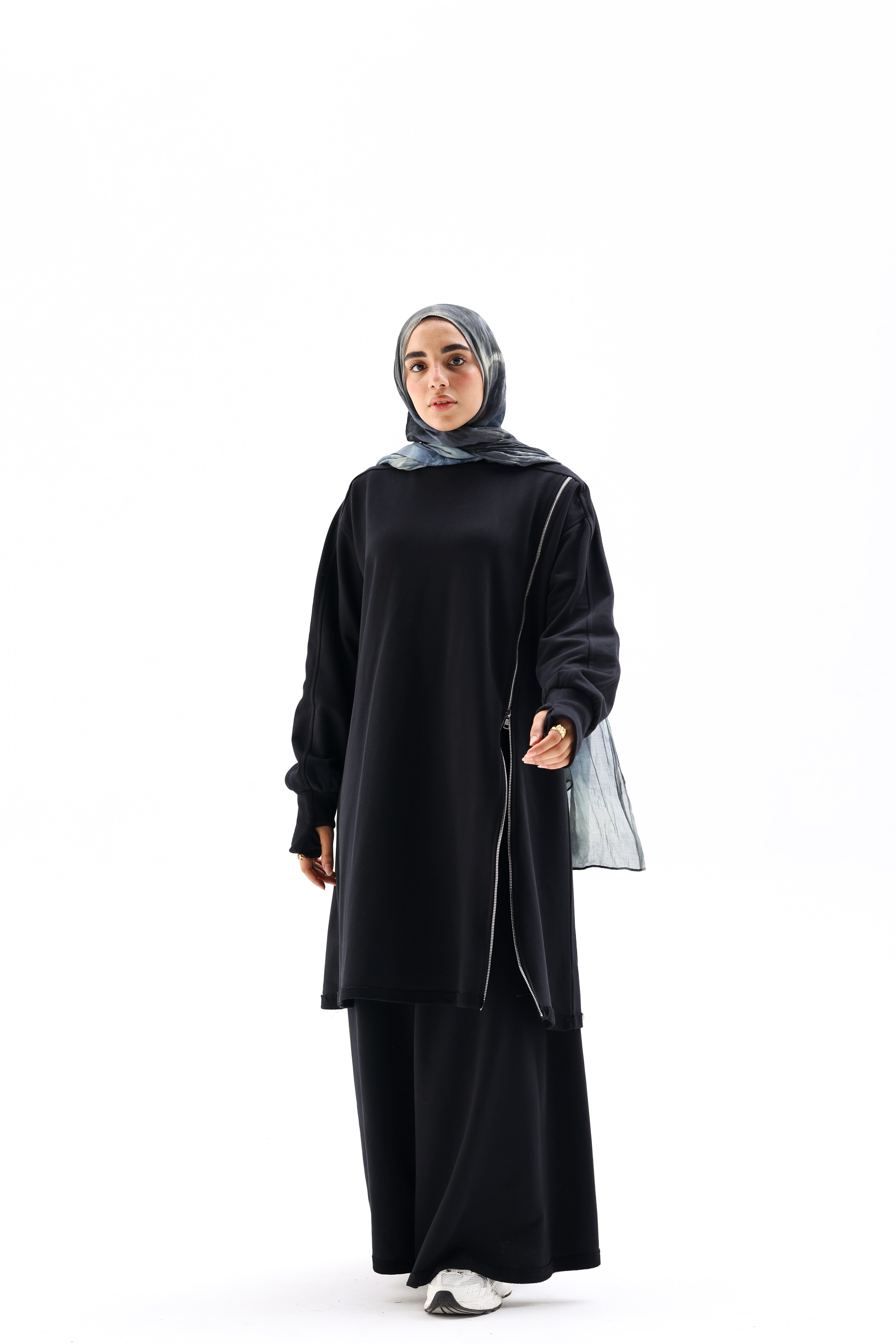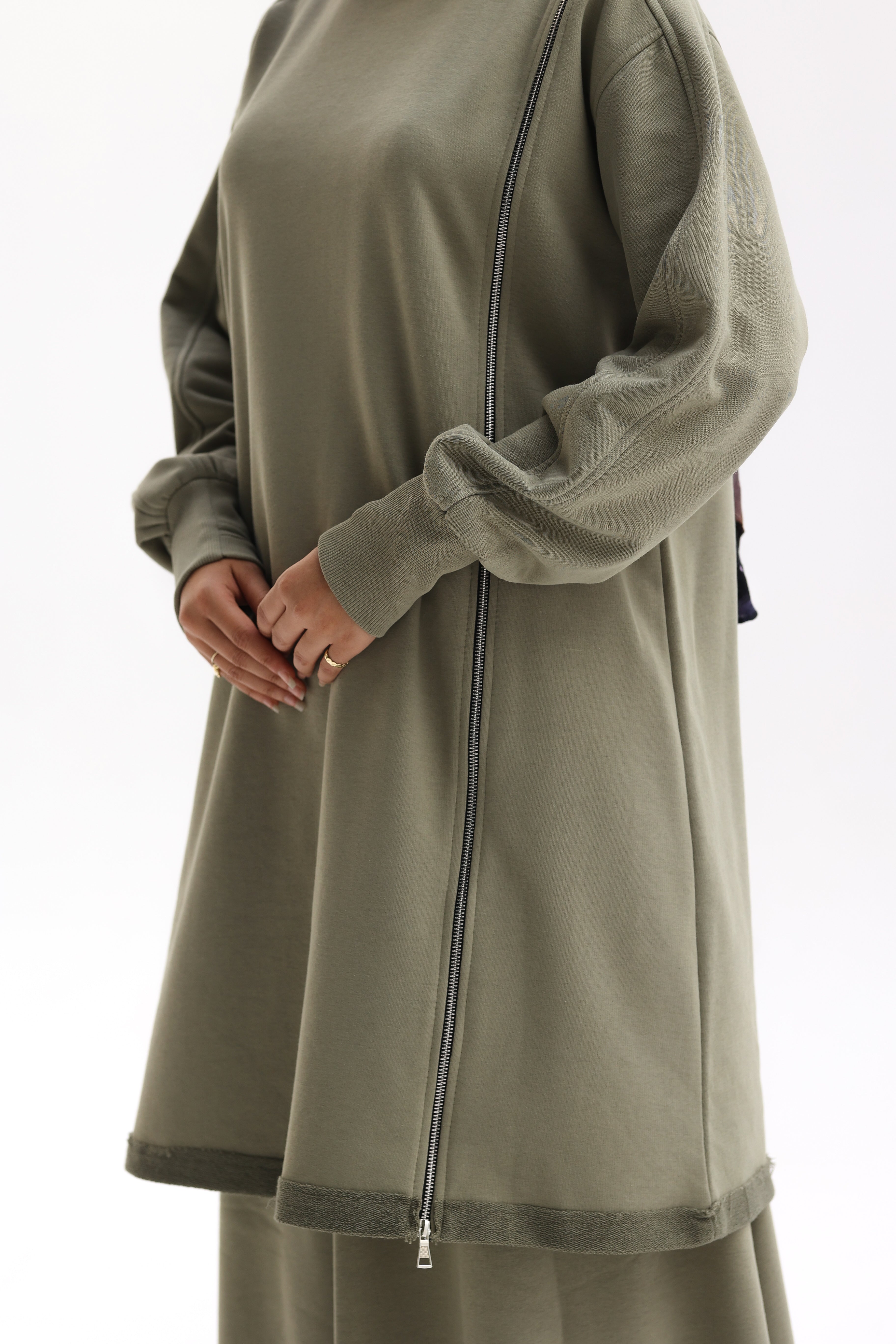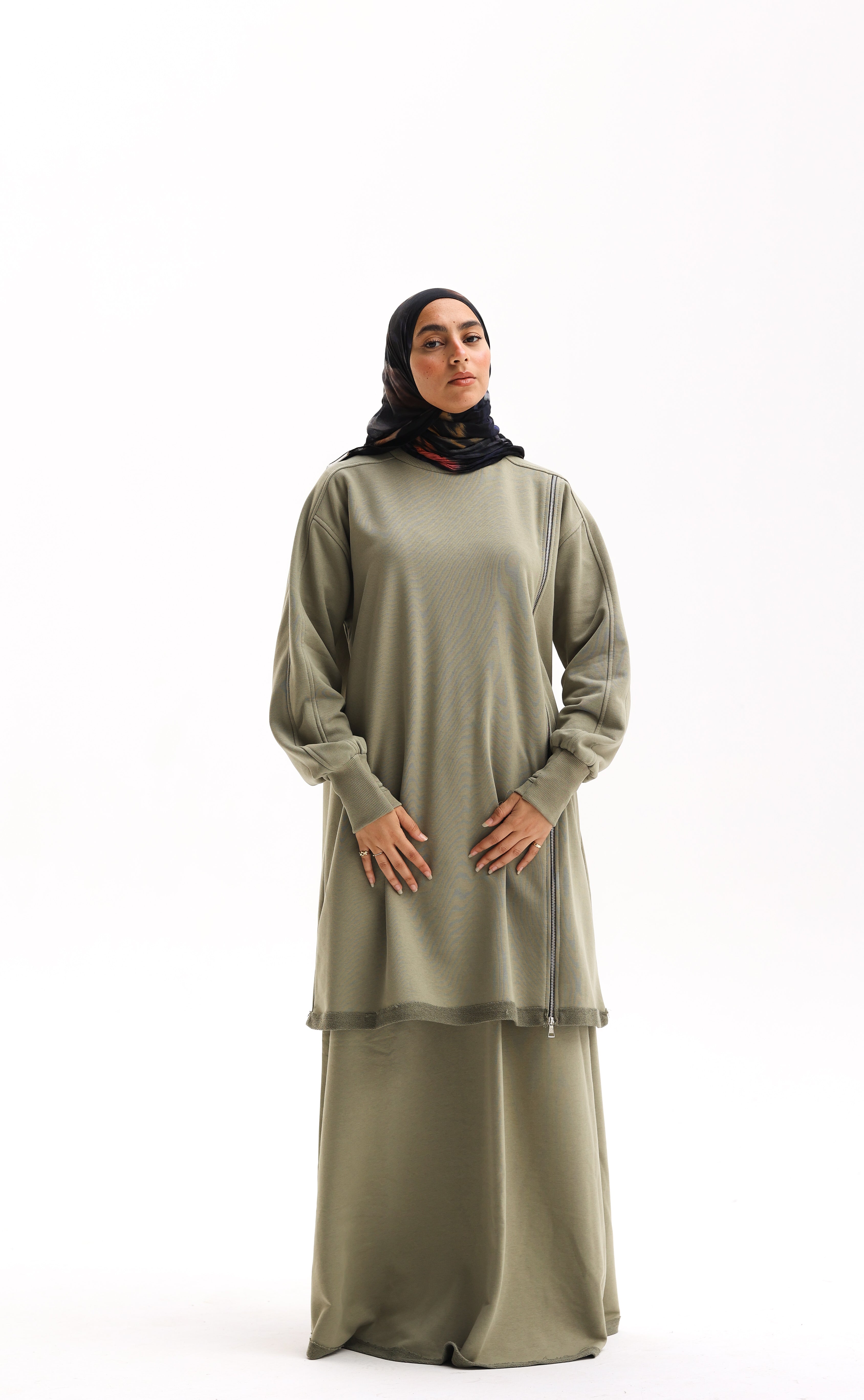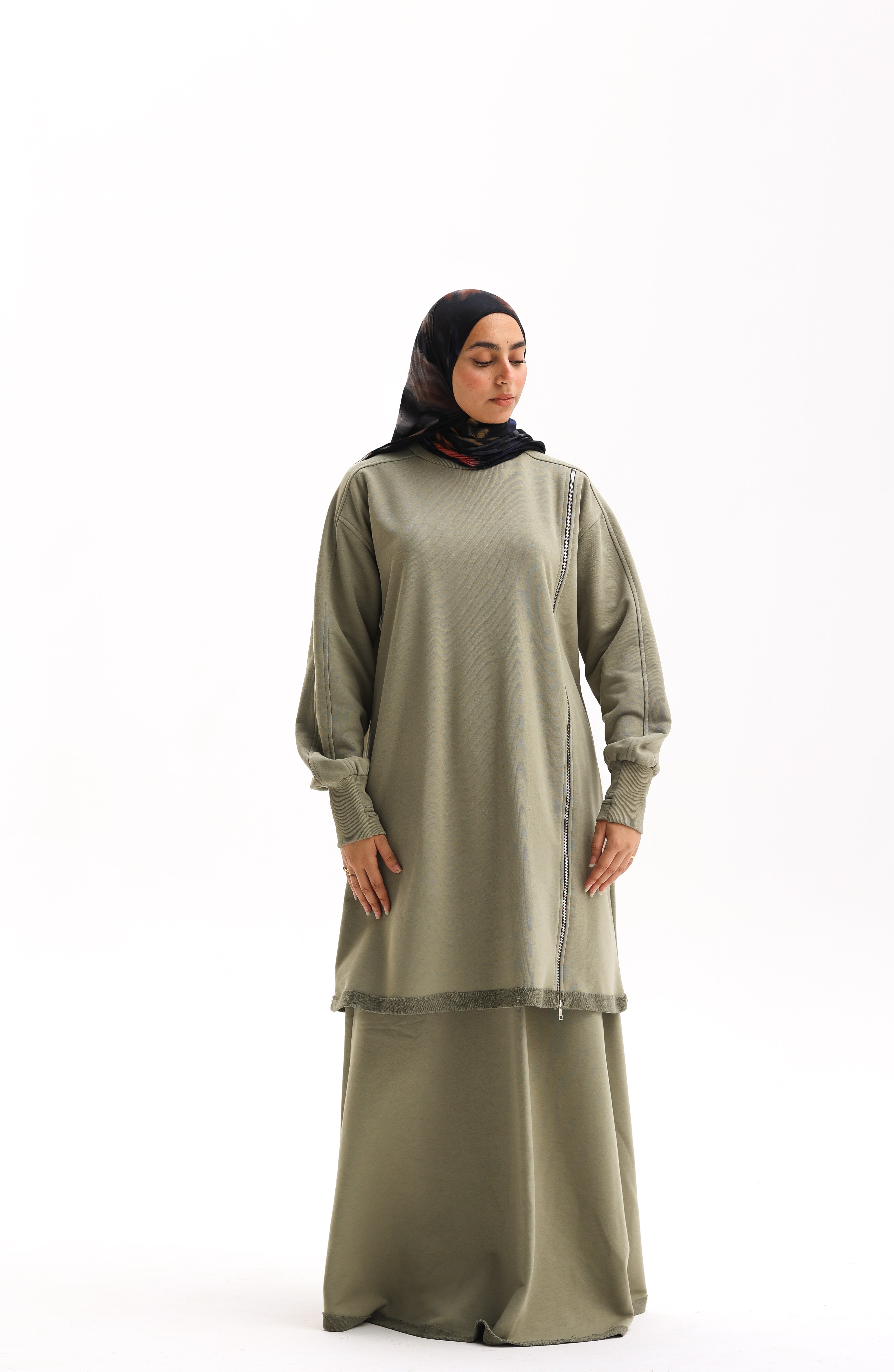 طقم شتوي مكوّن من تونيك بسوستة جانبية وجيب واسع، من خامة ميلتون ناعمة ودافئة. Two-piece winter set featuring a side-zip tunic and wide skirt in soft melton fabric.