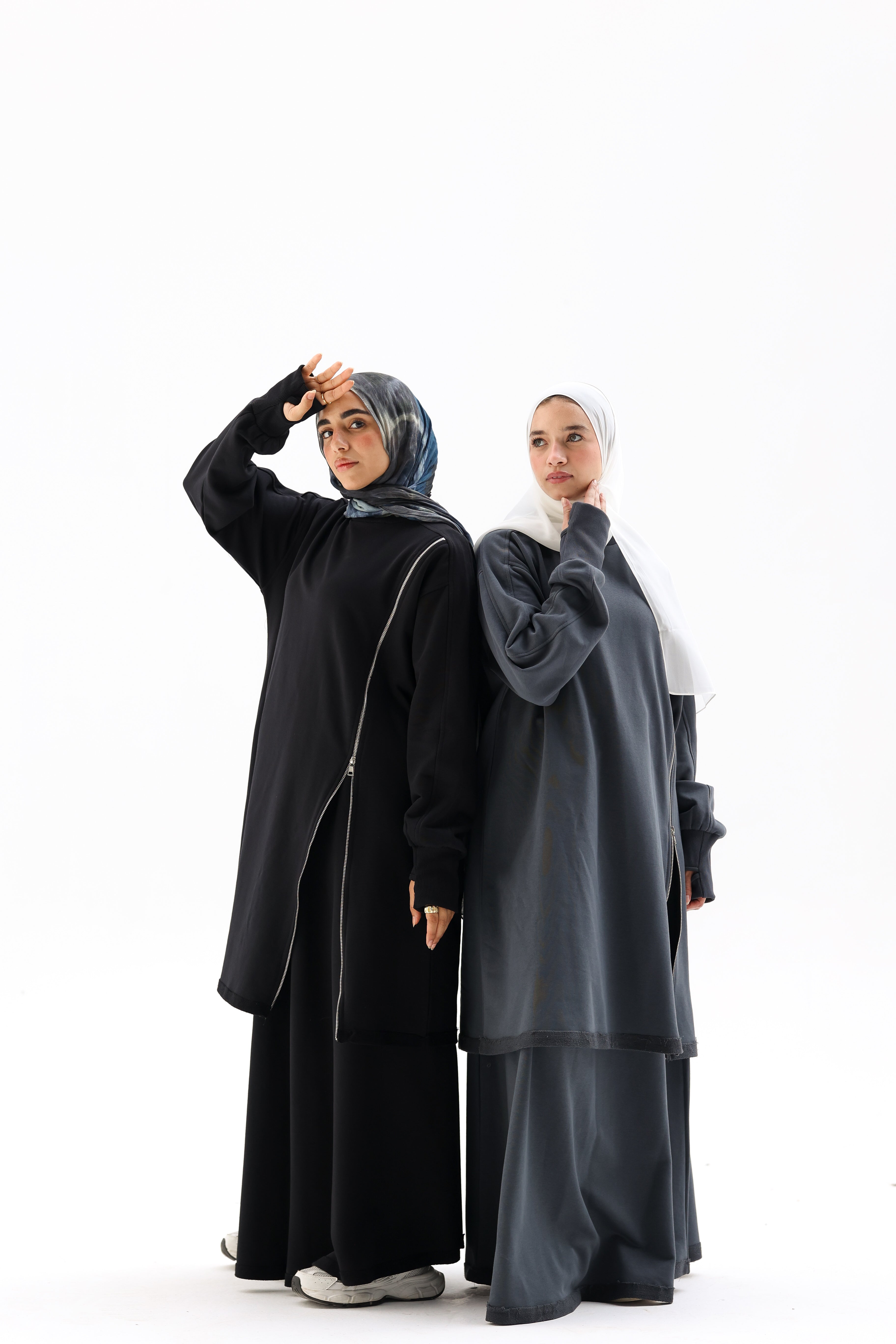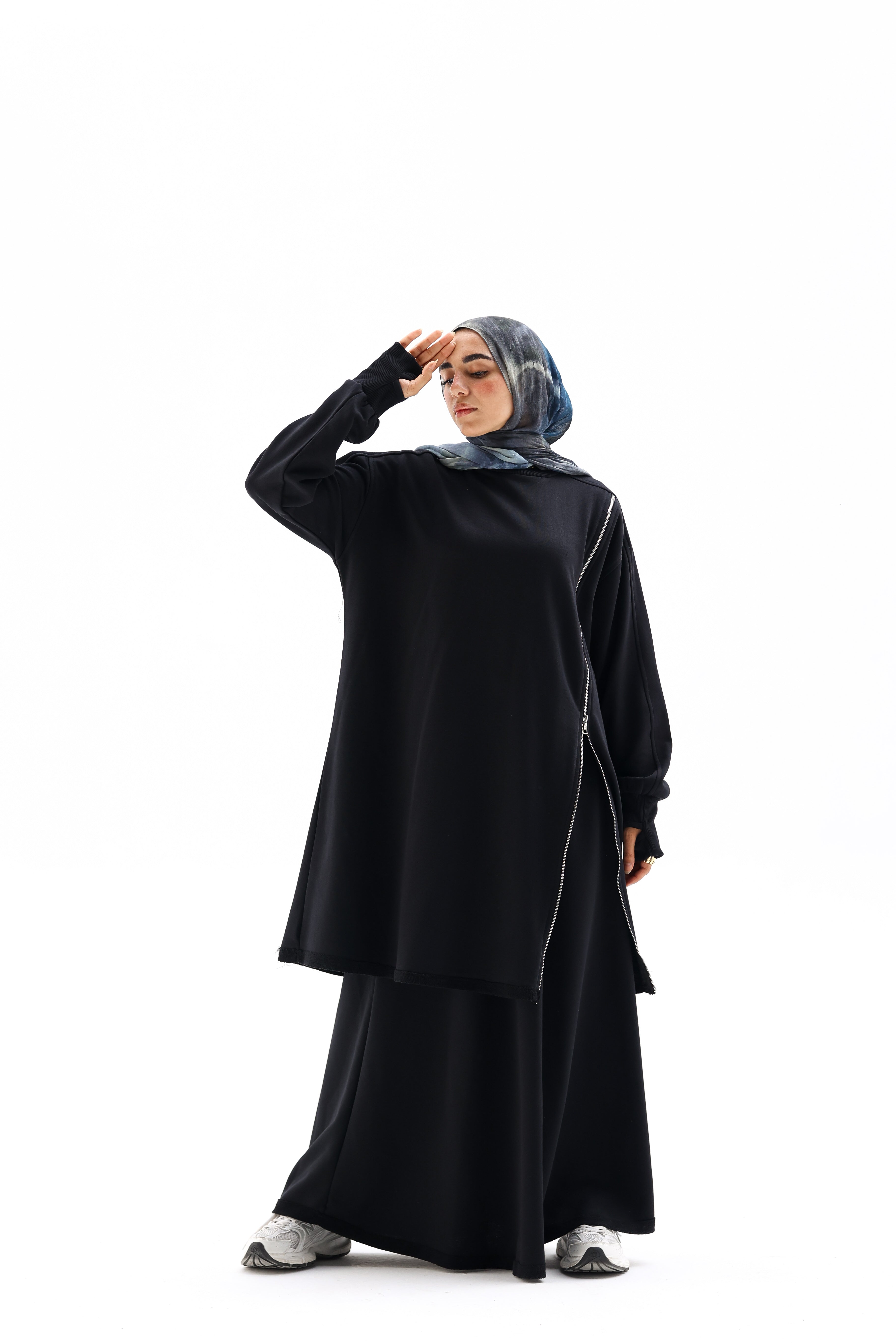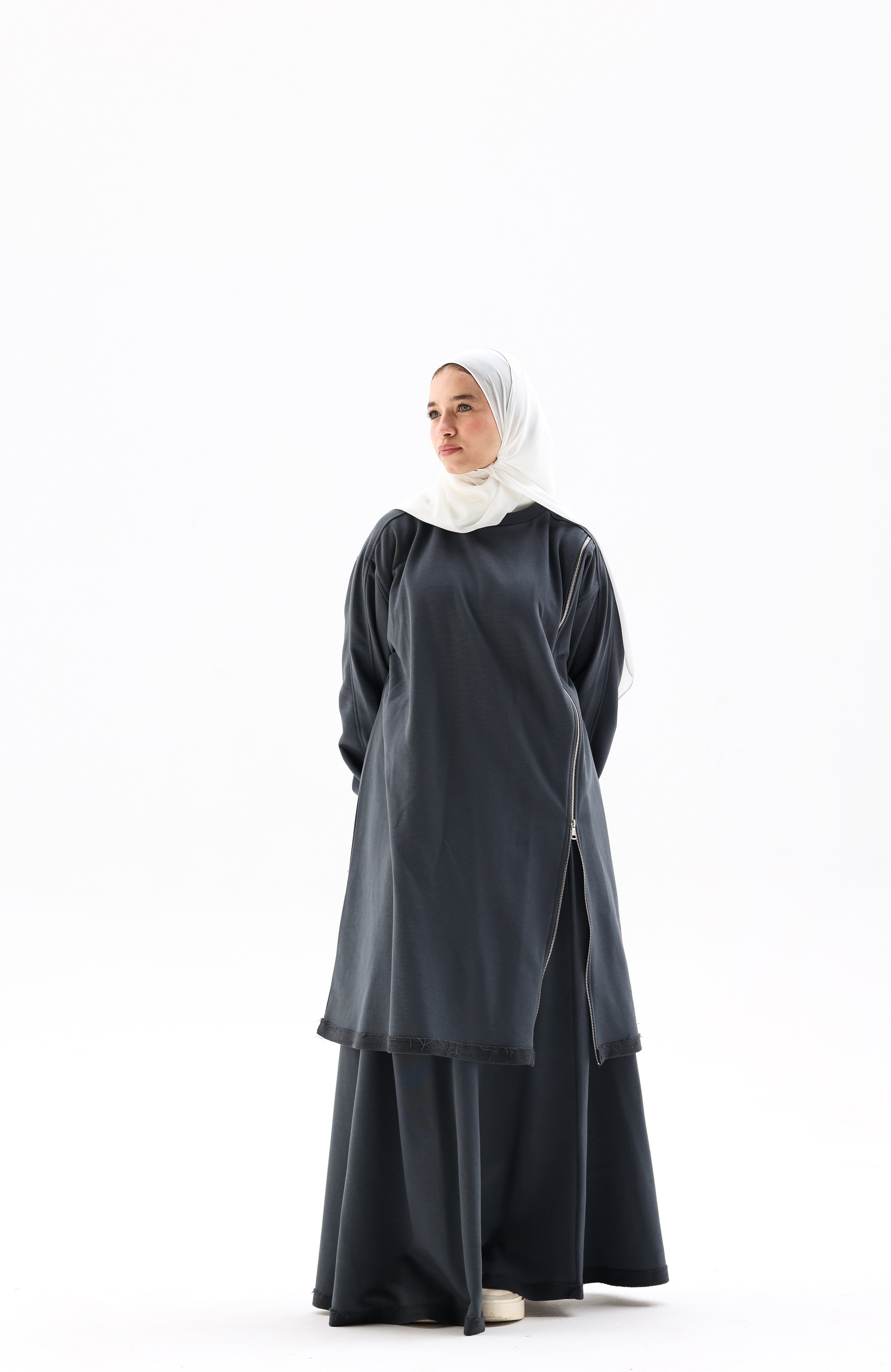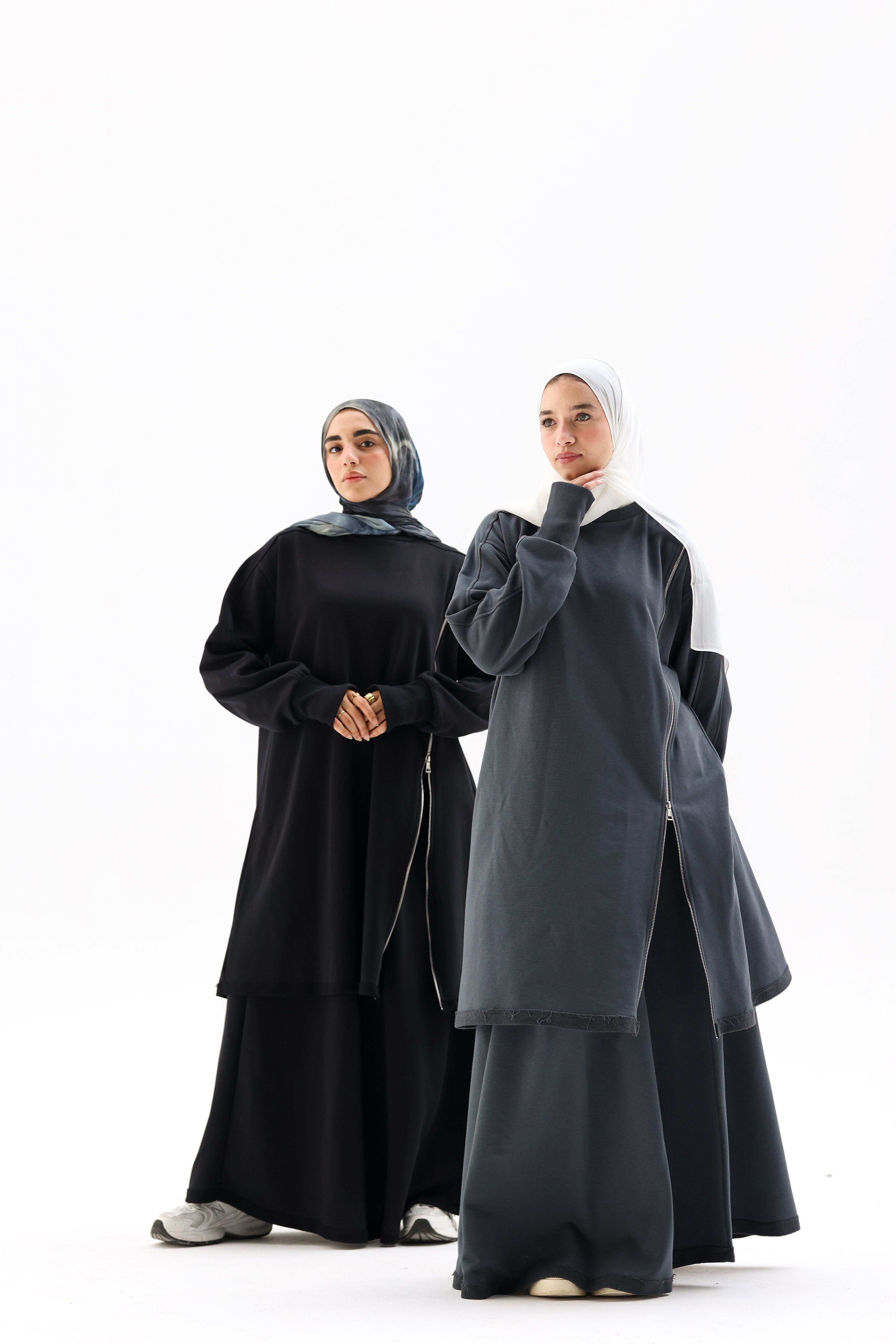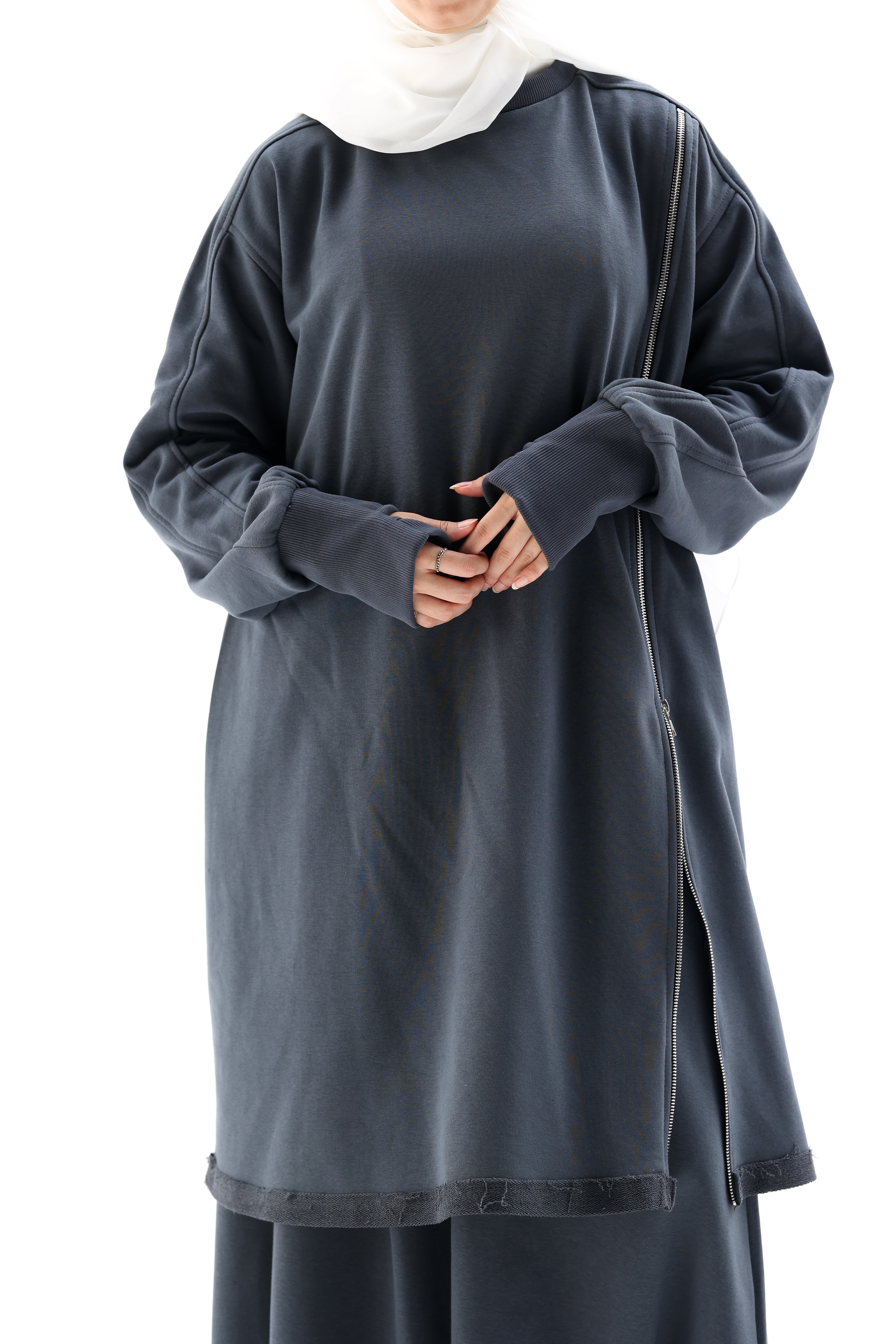 طقم شتوي مكوّن من تونيك بسوستة جانبية وجيب واسع، من خامة ميلتون ناعمة ودافئة. Two-piece winter set featuring a side-zip tunic and wide skirt in soft melton fabric.