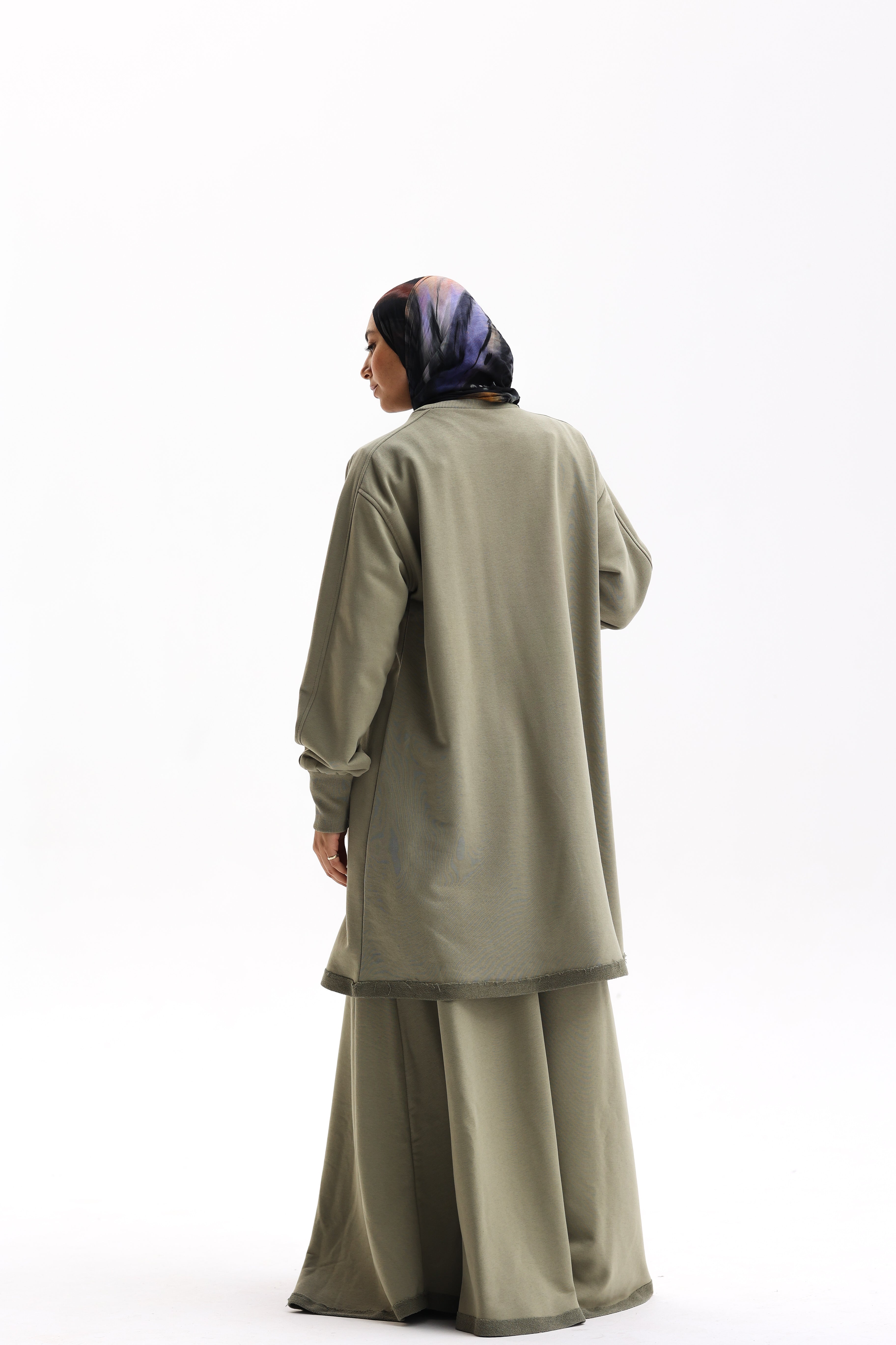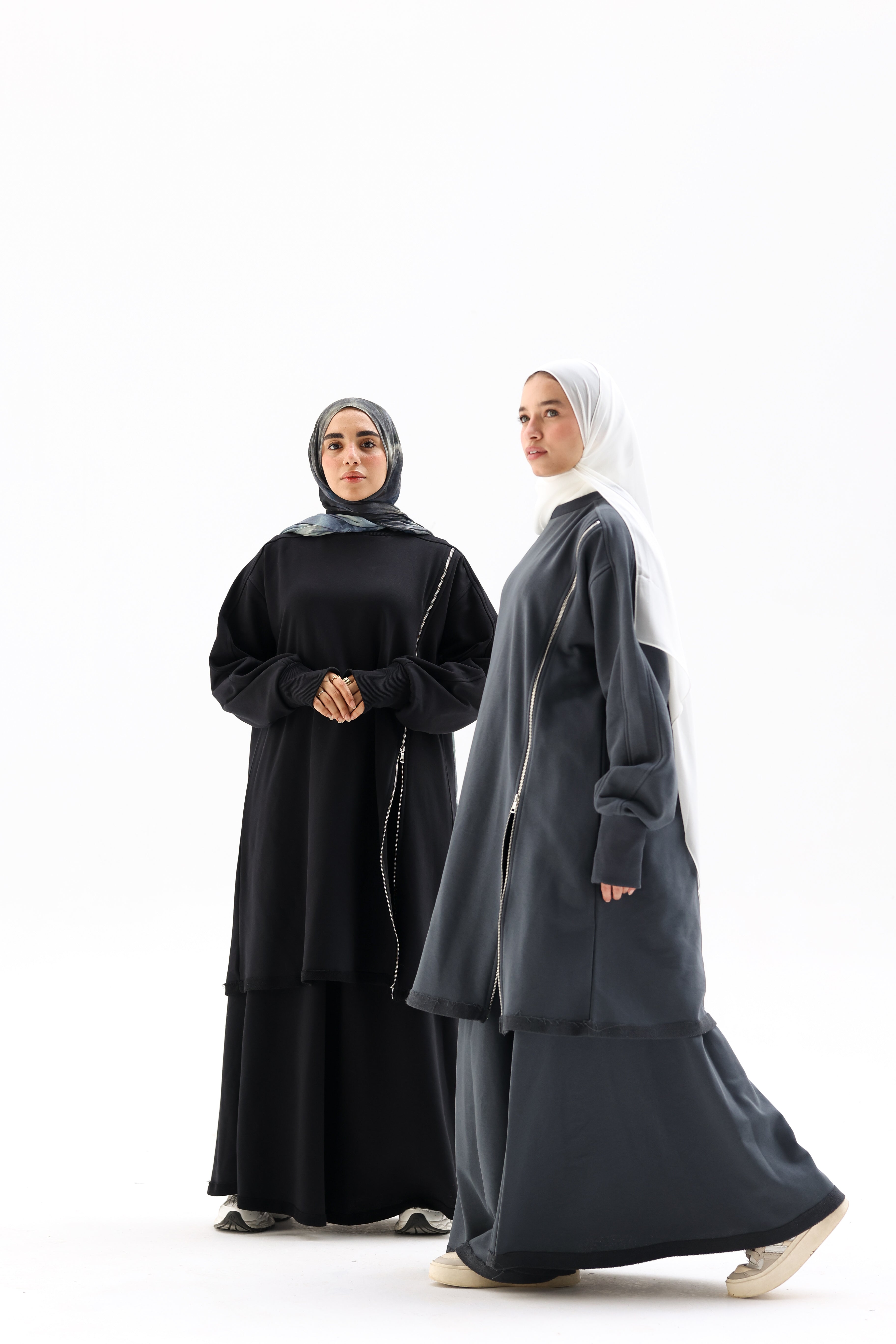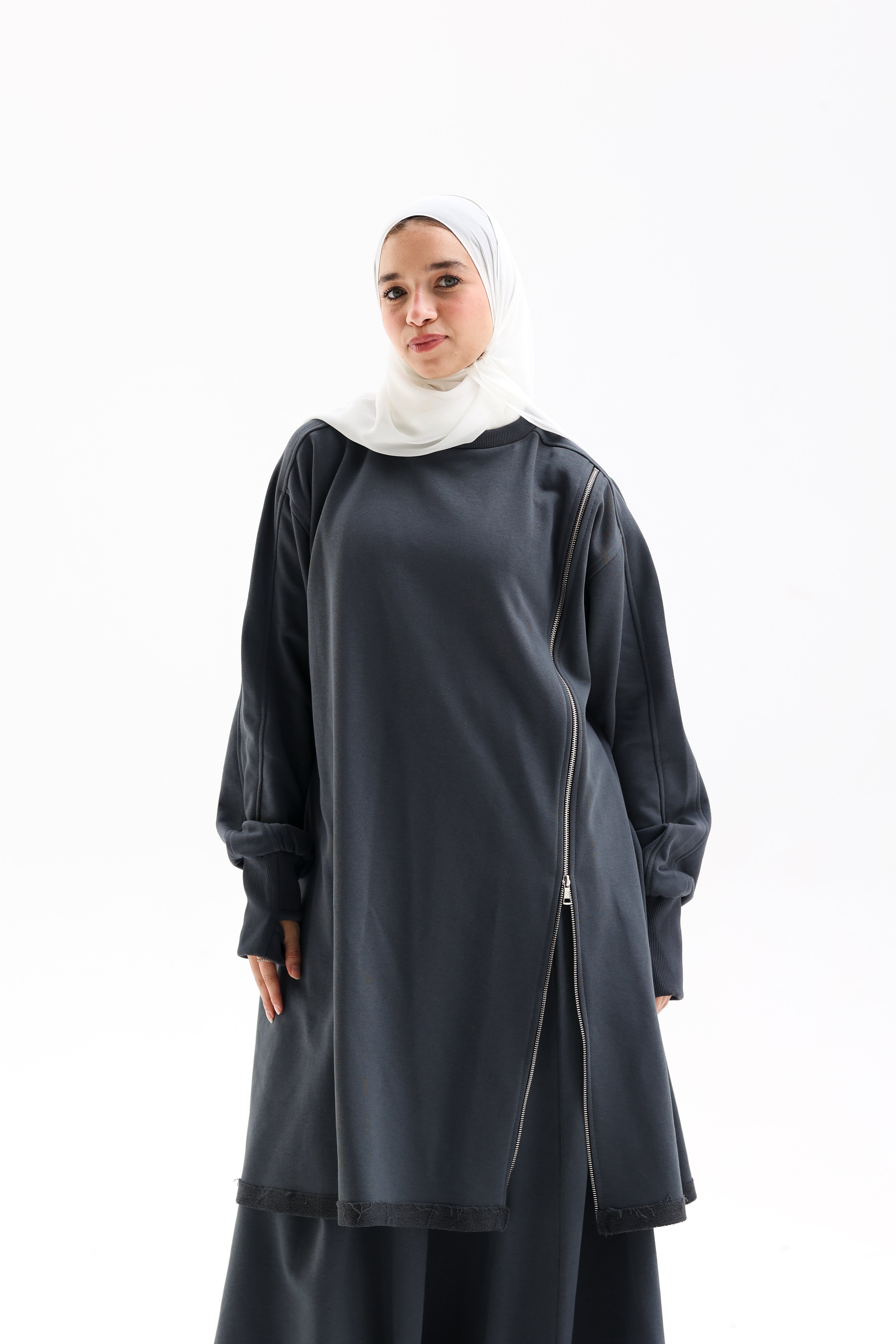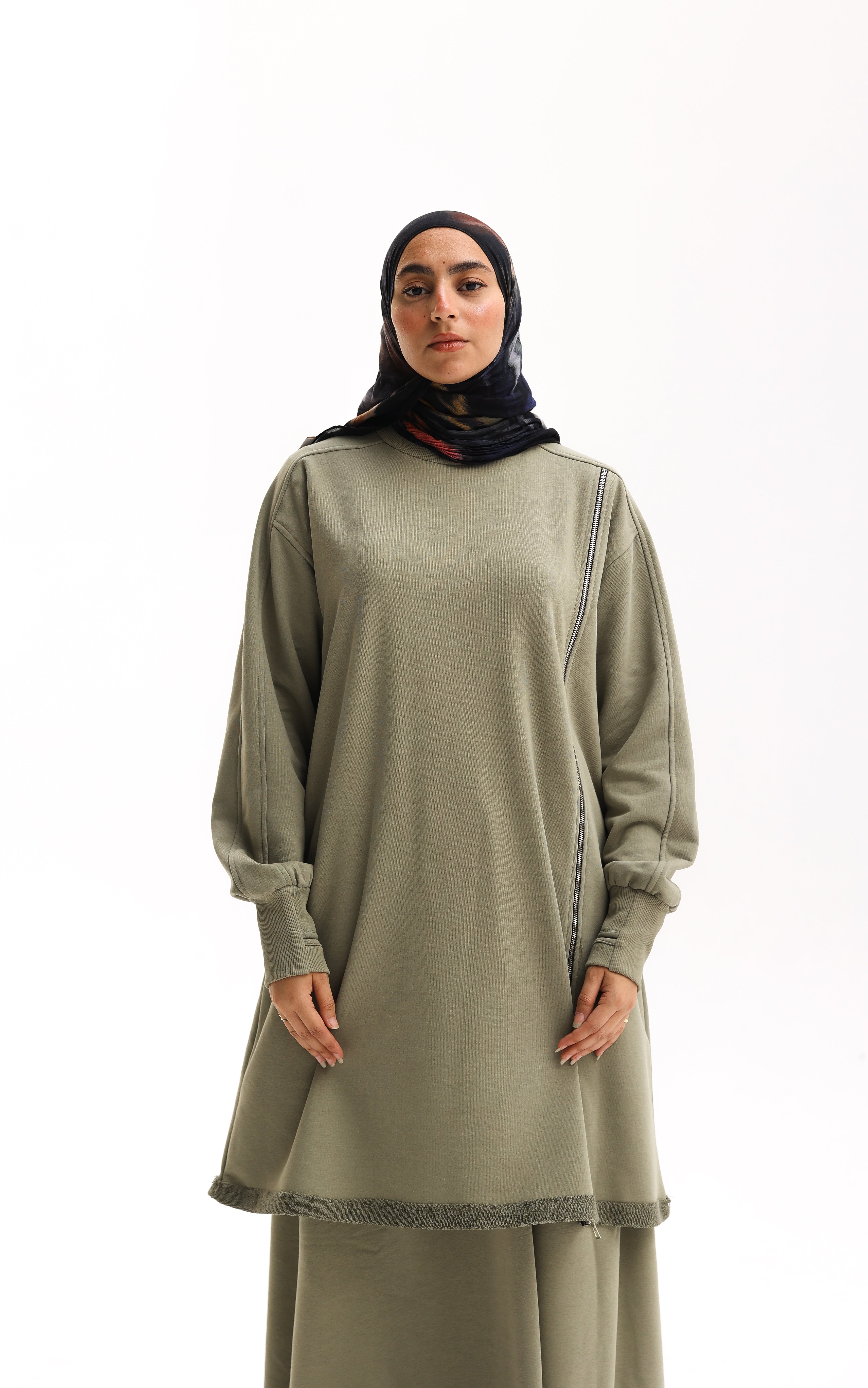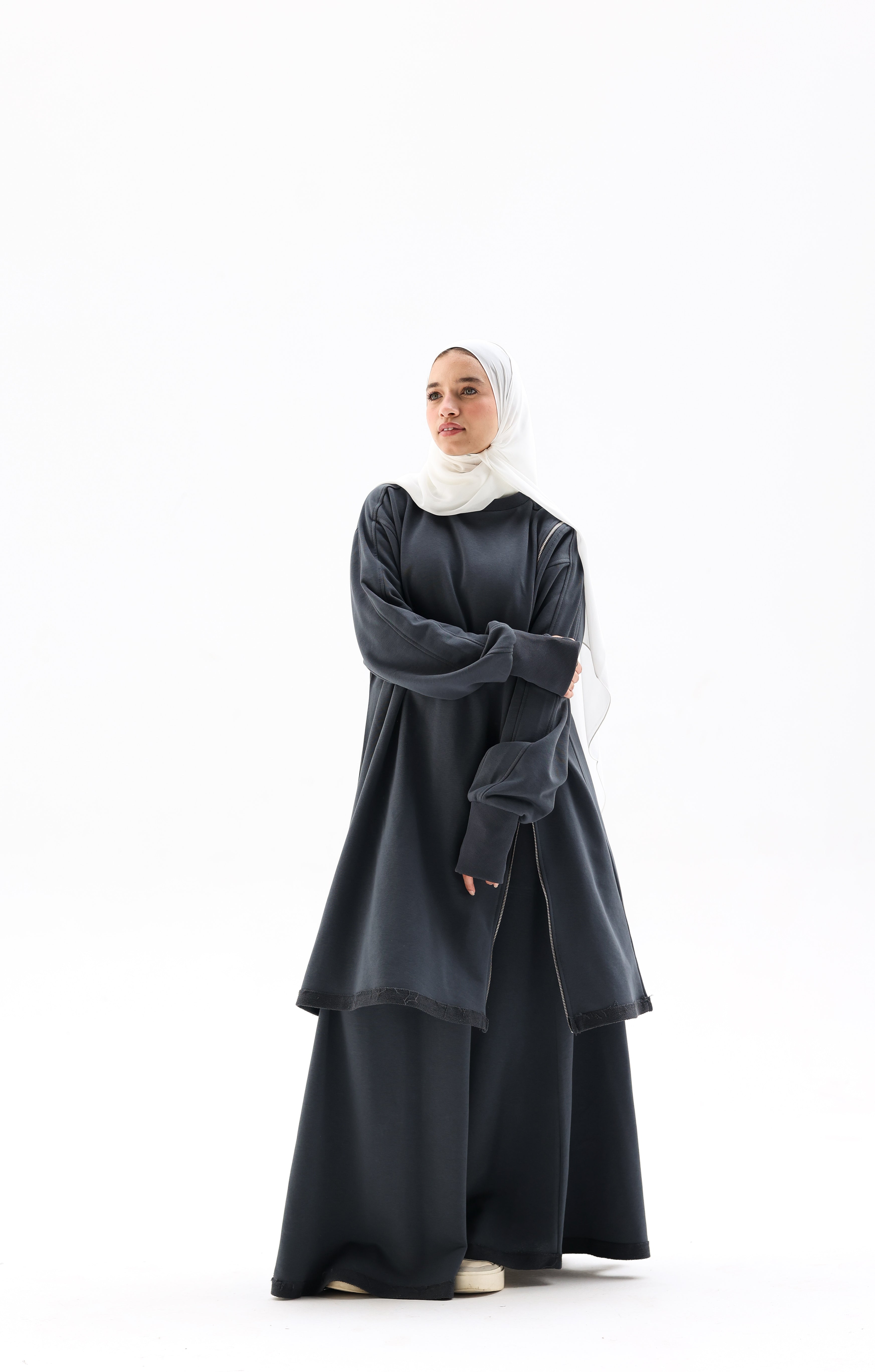 طقم شتوي مكوّن من تونيك بسوستة جانبية وجيب واسع، من خامة ميلتون ناعمة ودافئة. Two-piece winter set featuring a side-zip tunic and wide skirt in soft melton fabric.