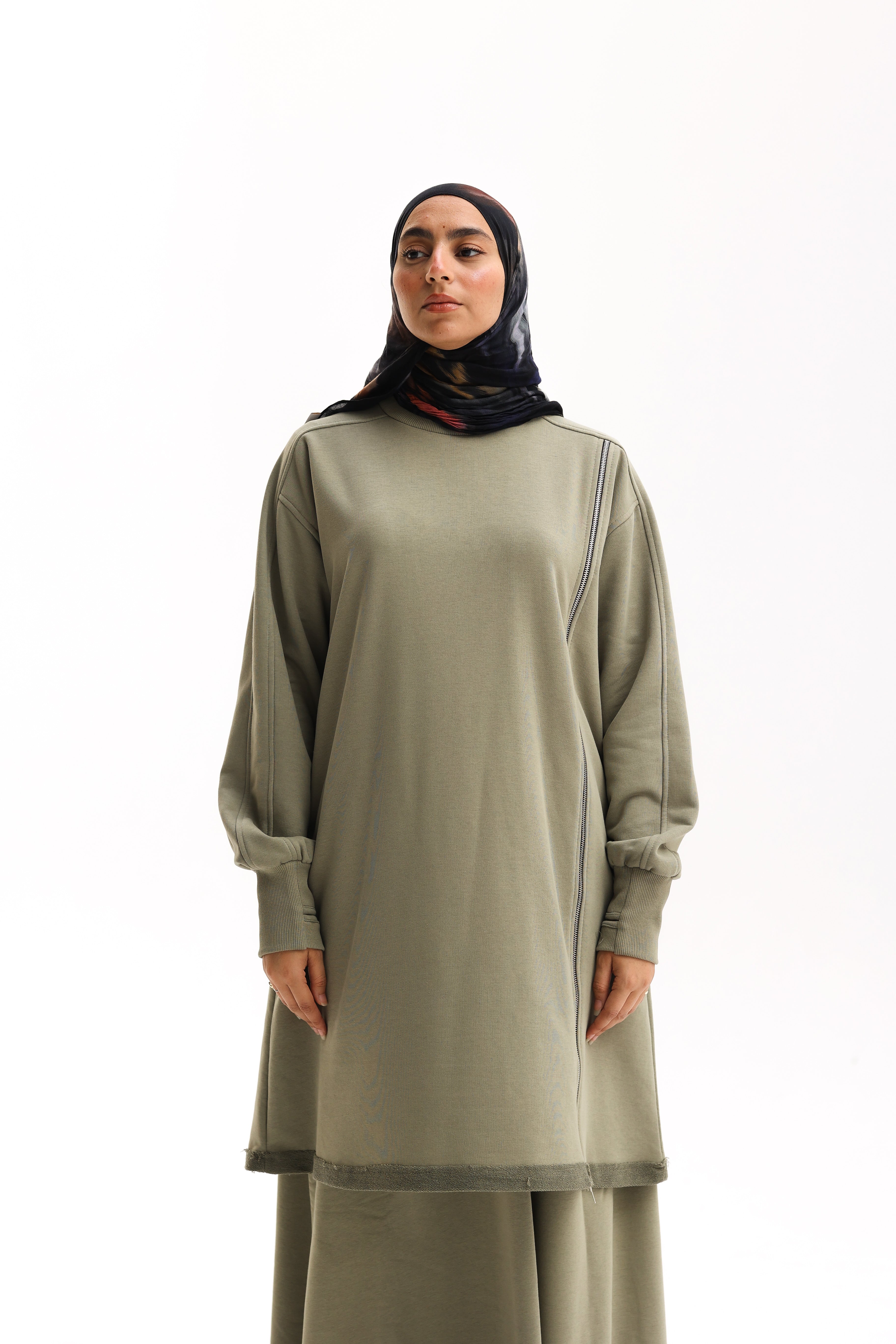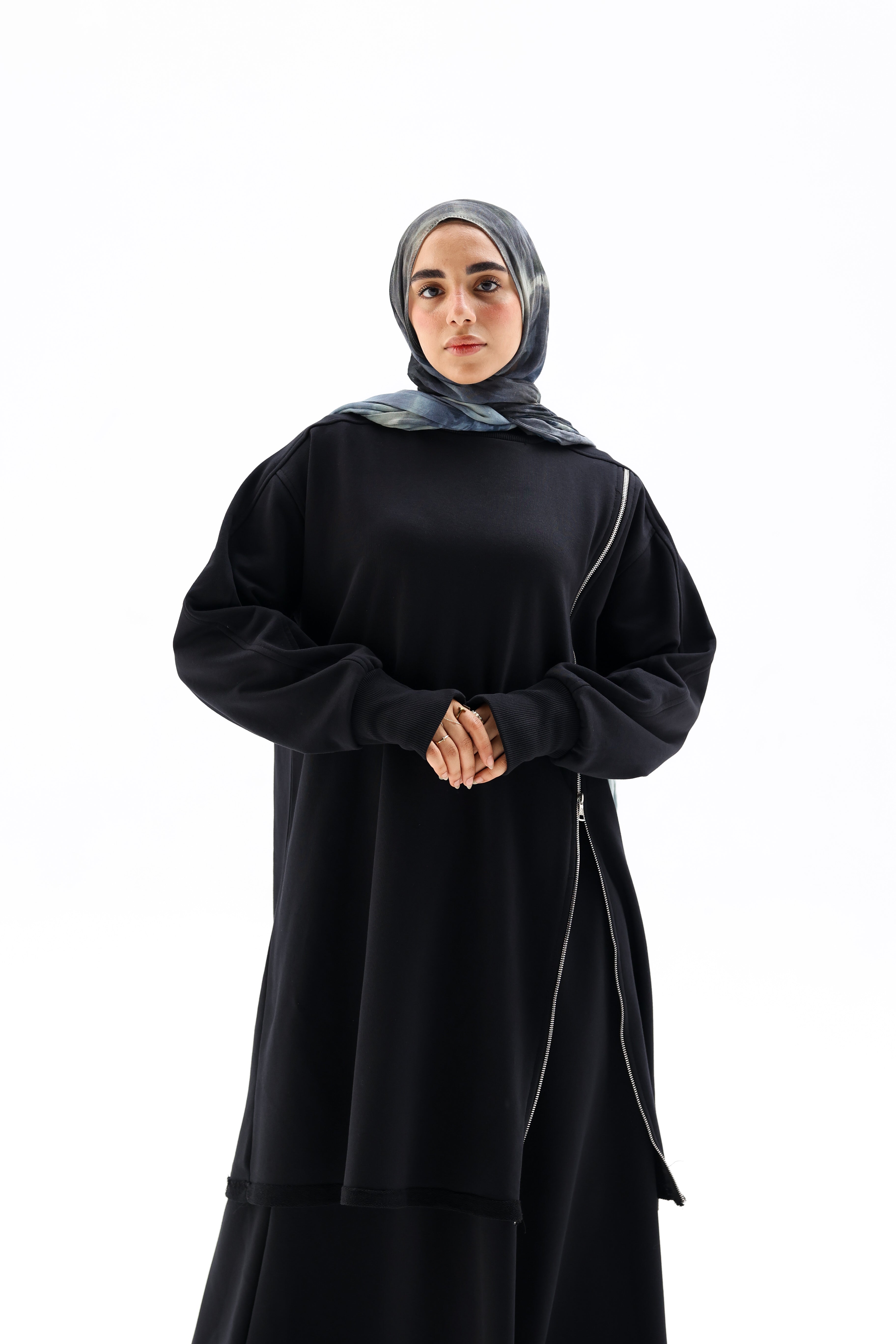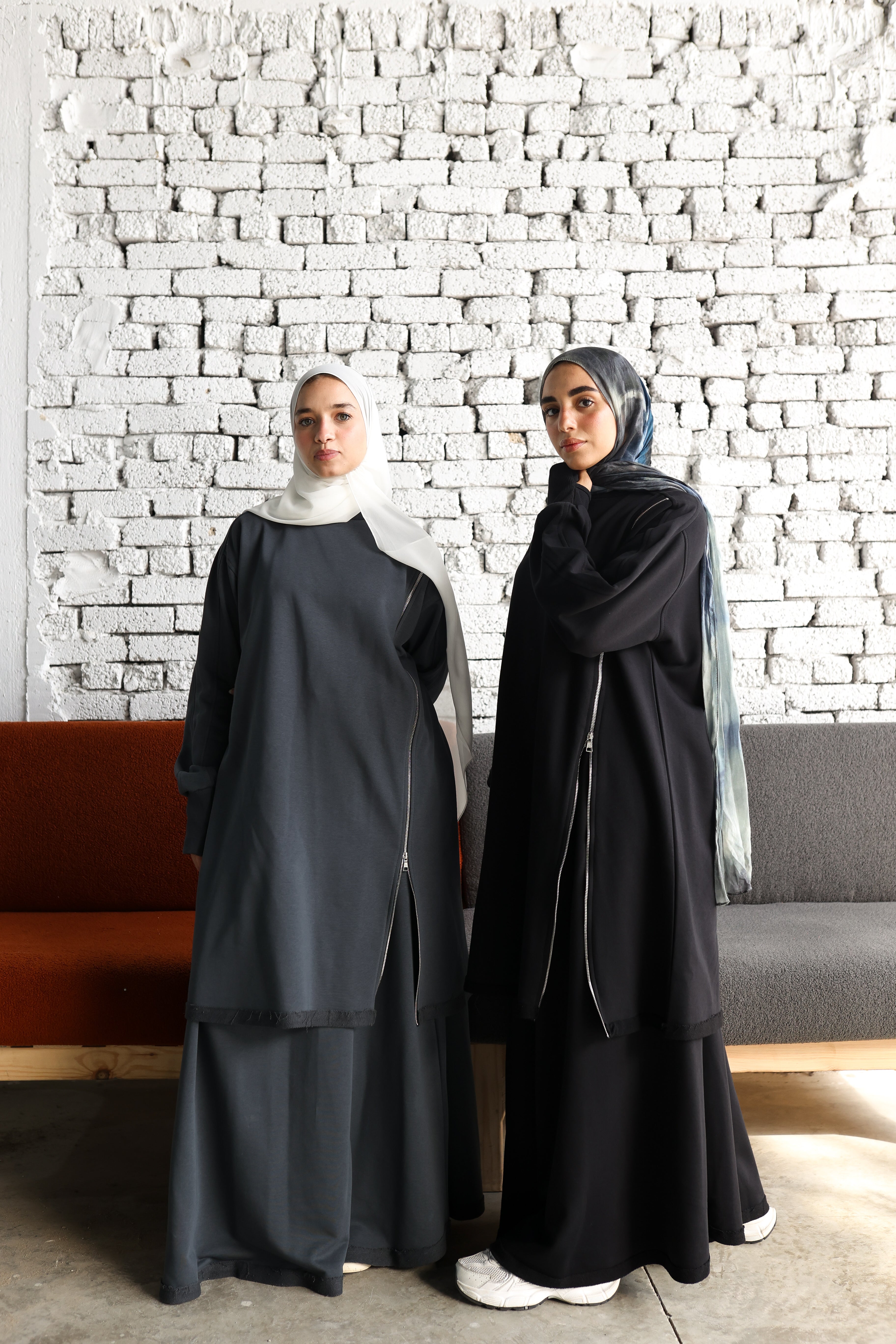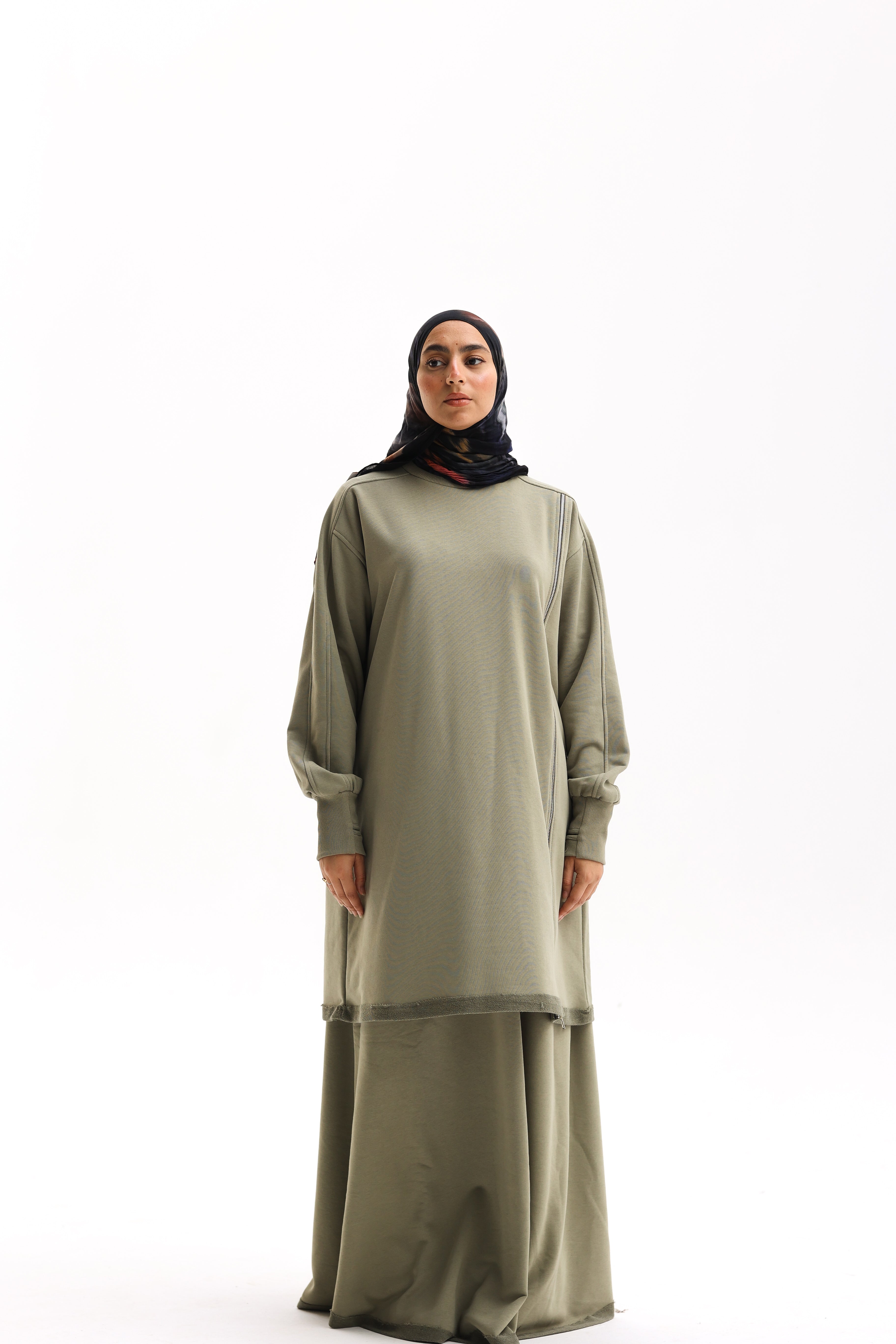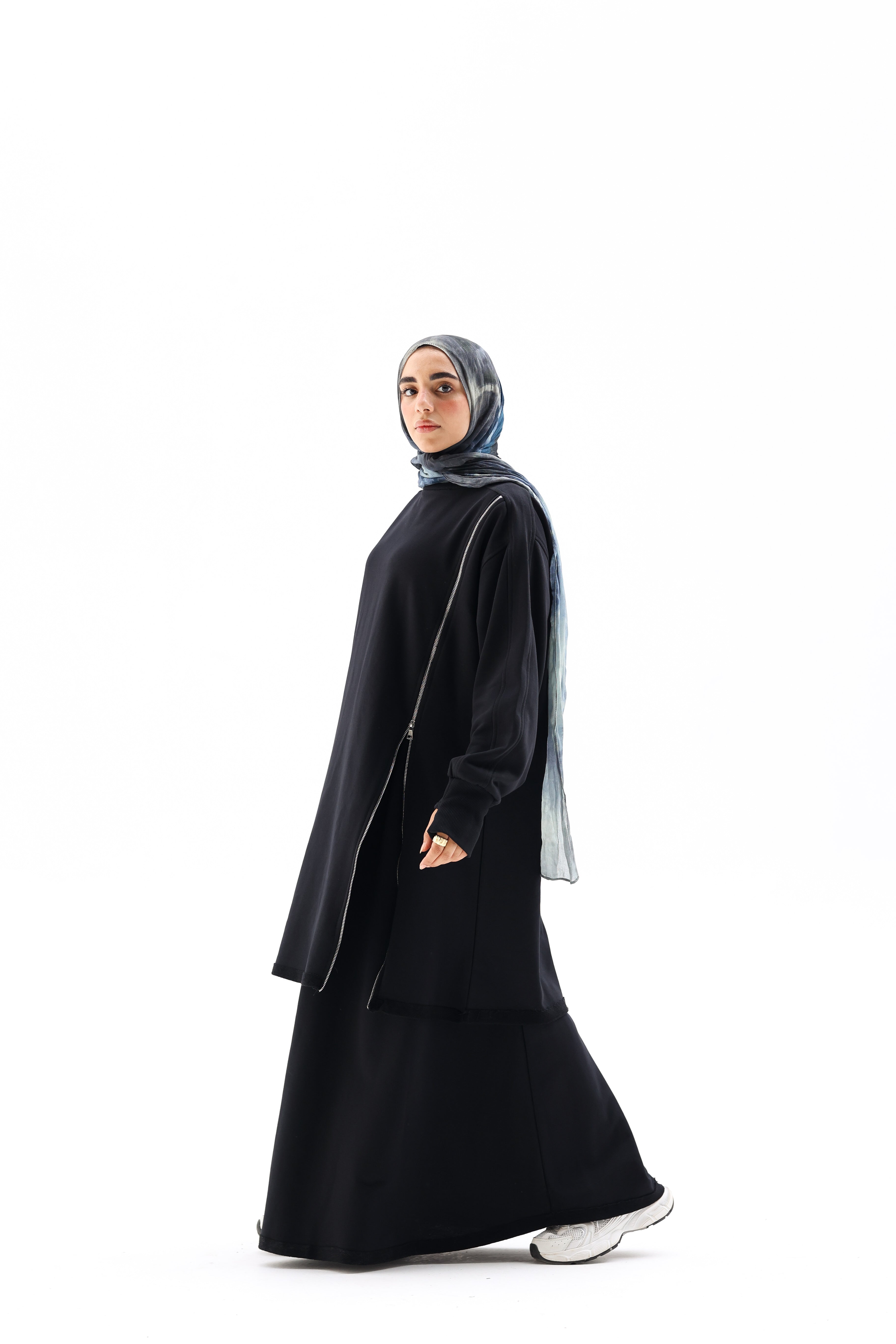 طقم شتوي مكوّن من تونيك بسوستة جانبية وجيب واسع، من خامة ميلتون ناعمة ودافئة. Two-piece winter set featuring a side-zip tunic and wide skirt in soft melton fabric.