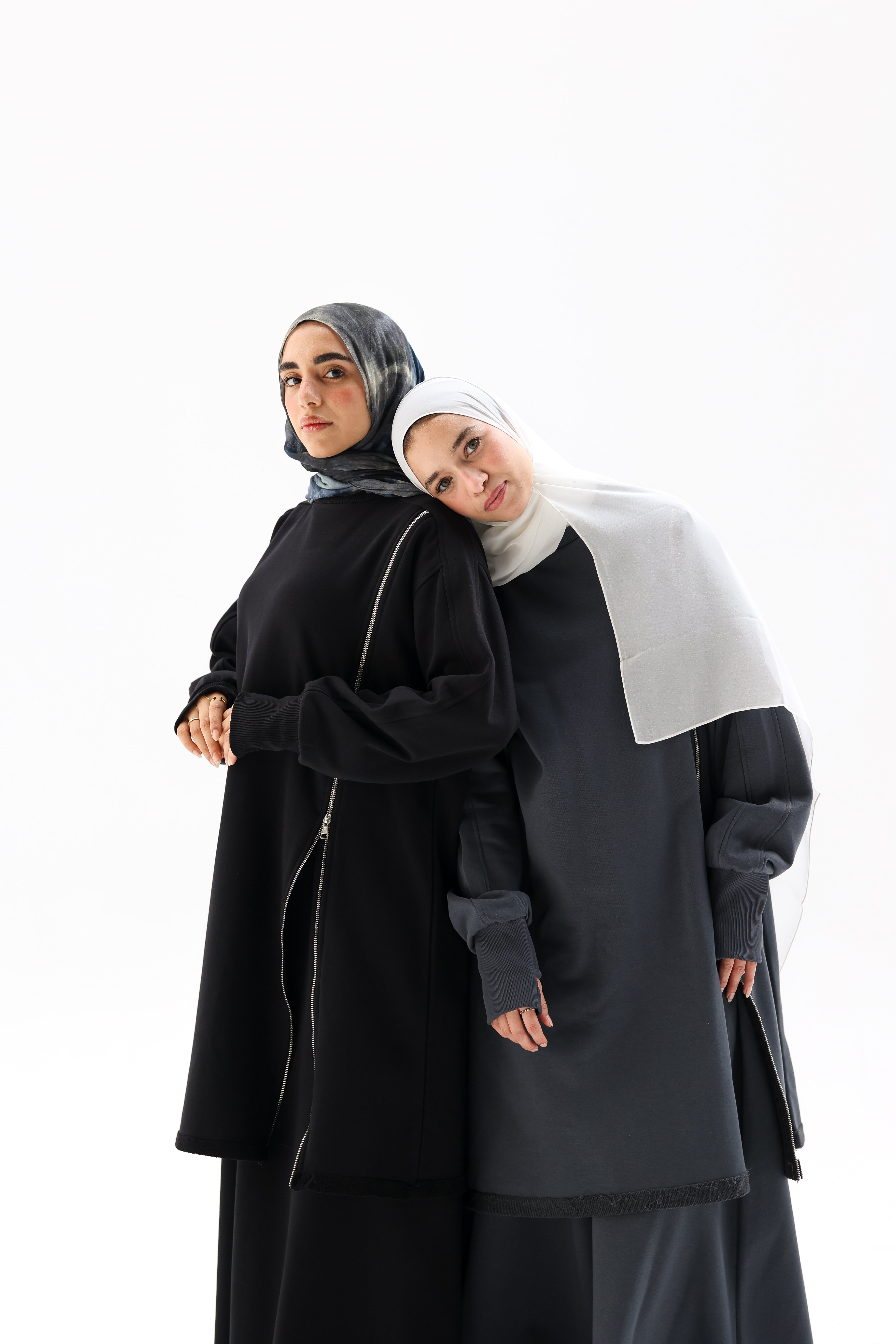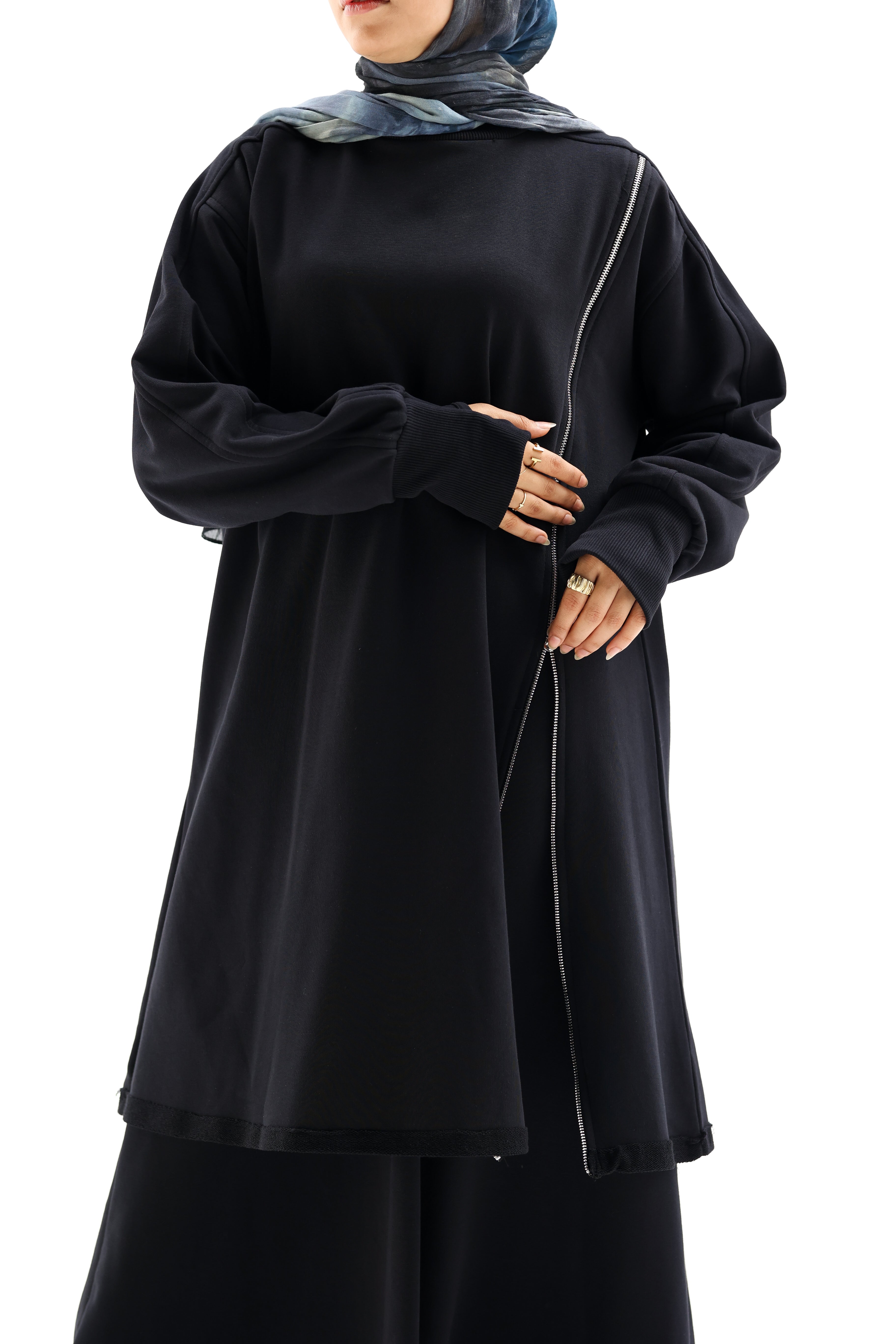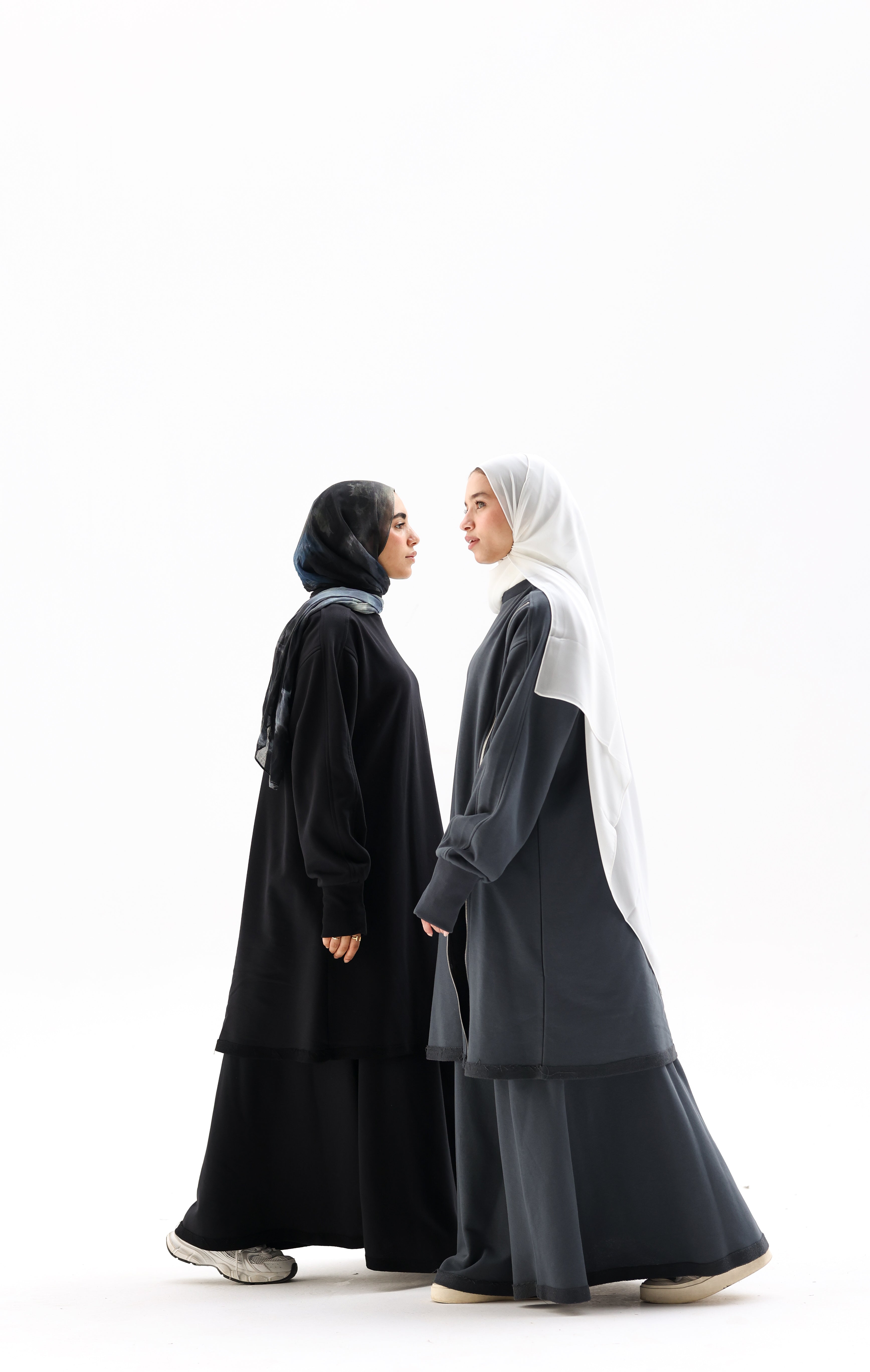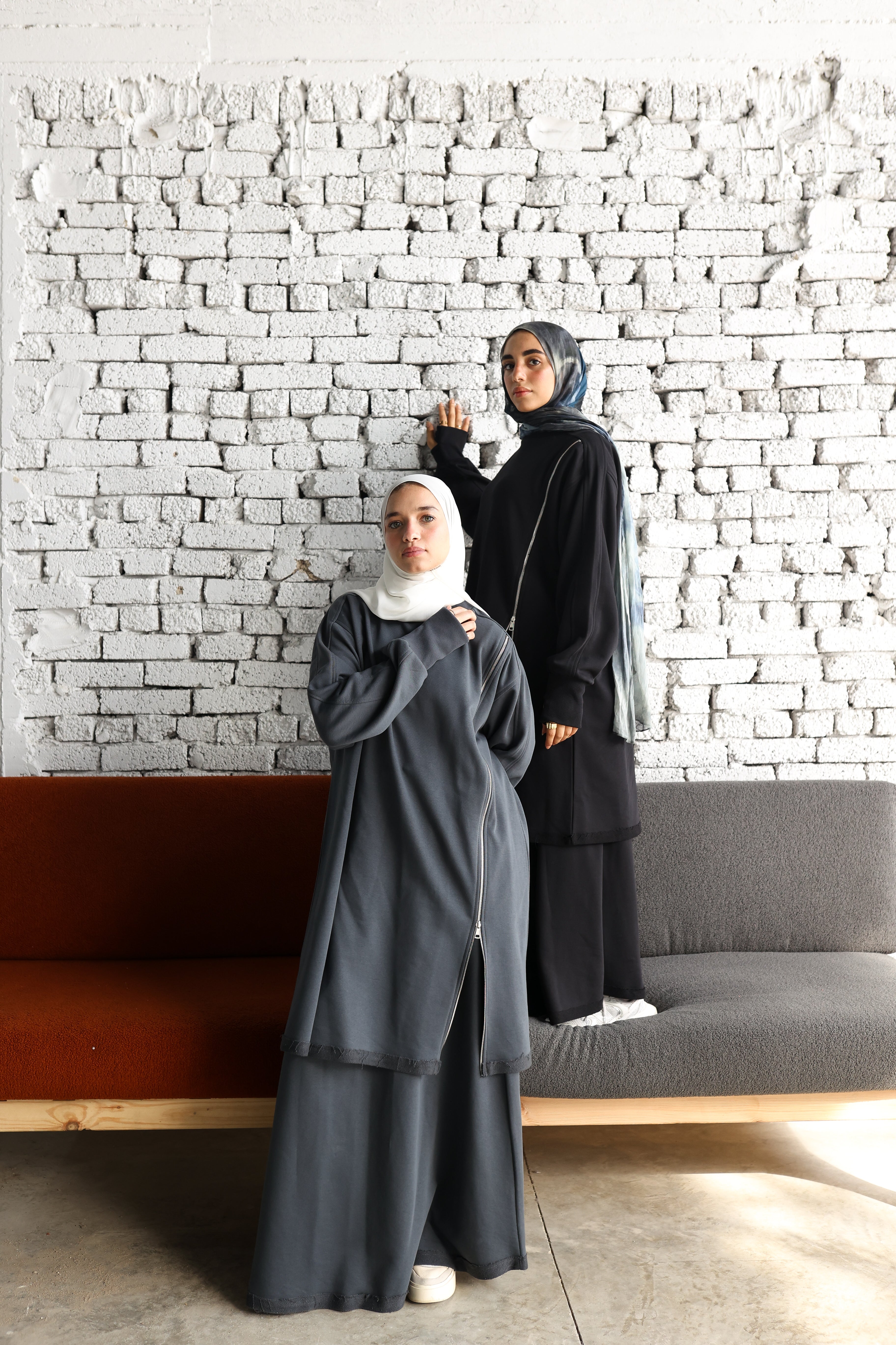 طقم شتوي مكوّن من تونيك بسوستة جانبية وجيب واسع، من خامة ميلتون ناعمة ودافئة. Two-piece winter set featuring a side-zip tunic and wide skirt in soft melton fabric.