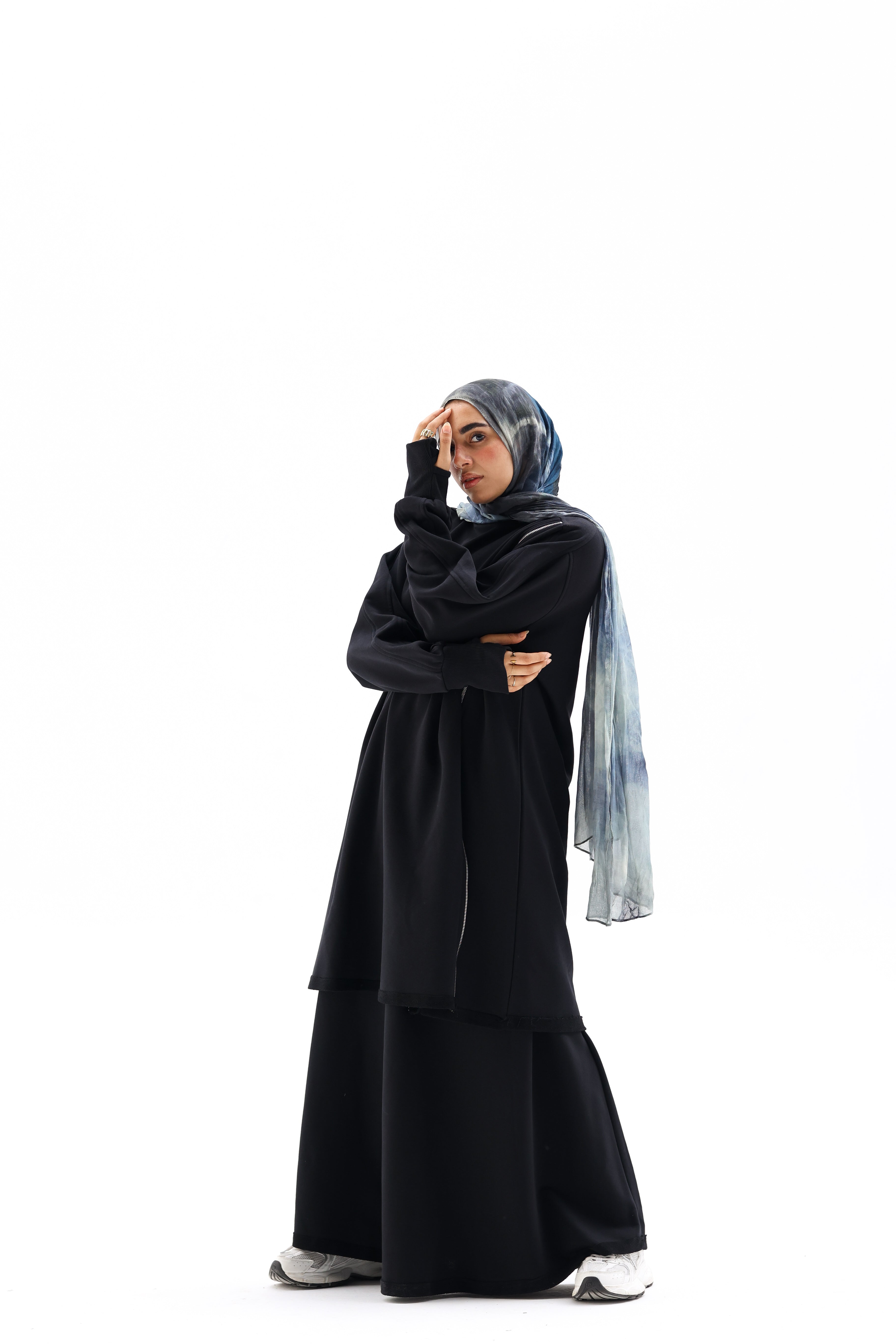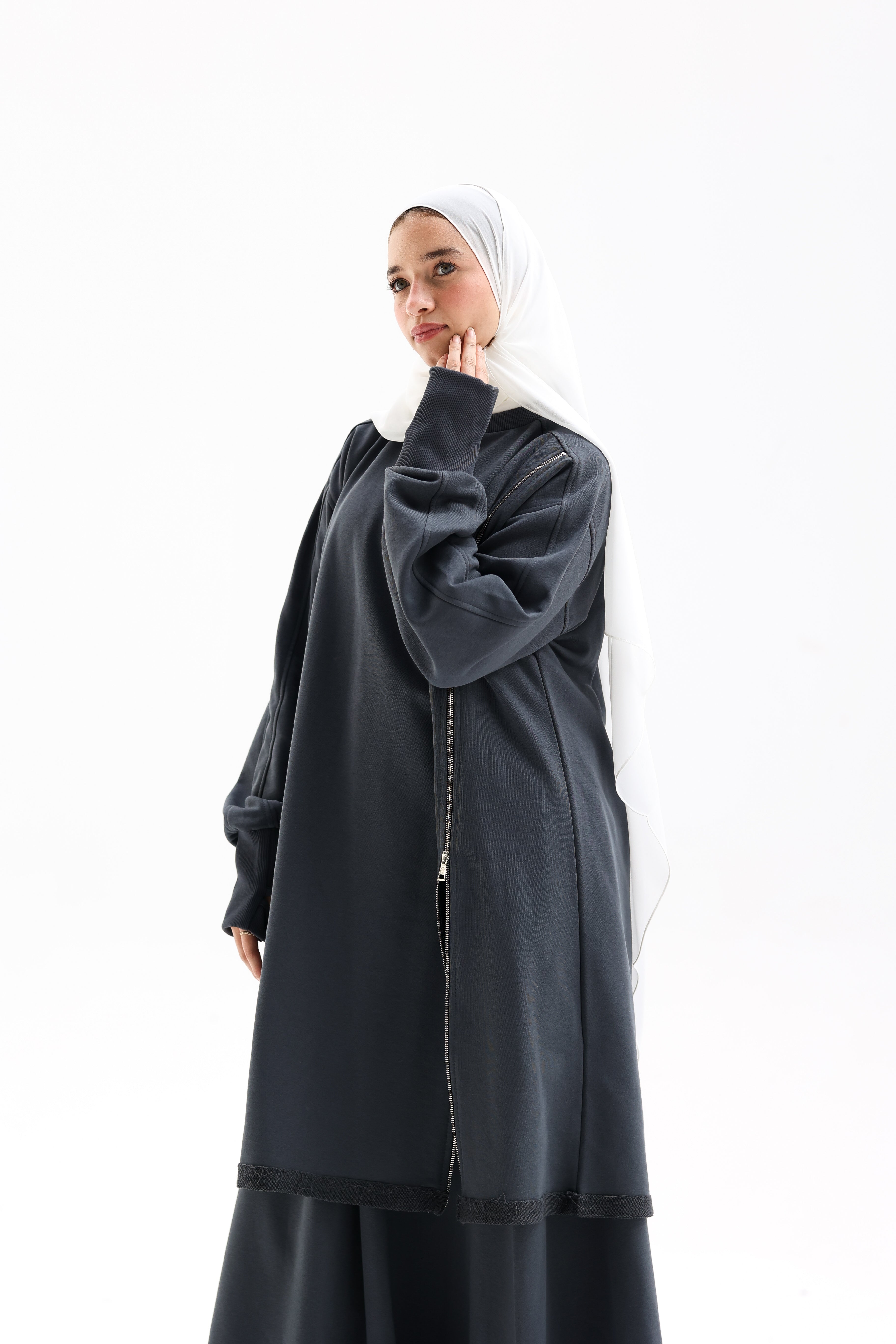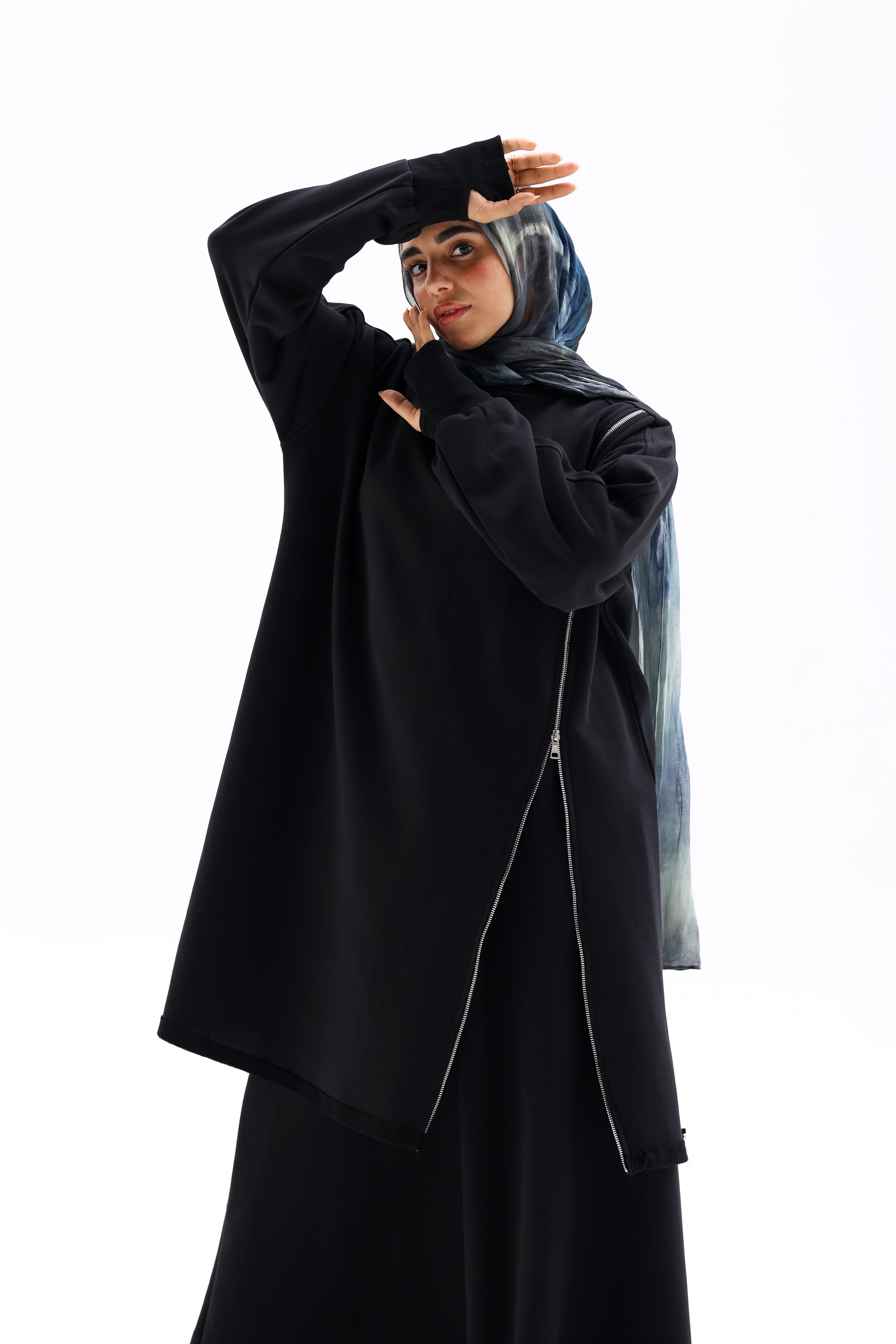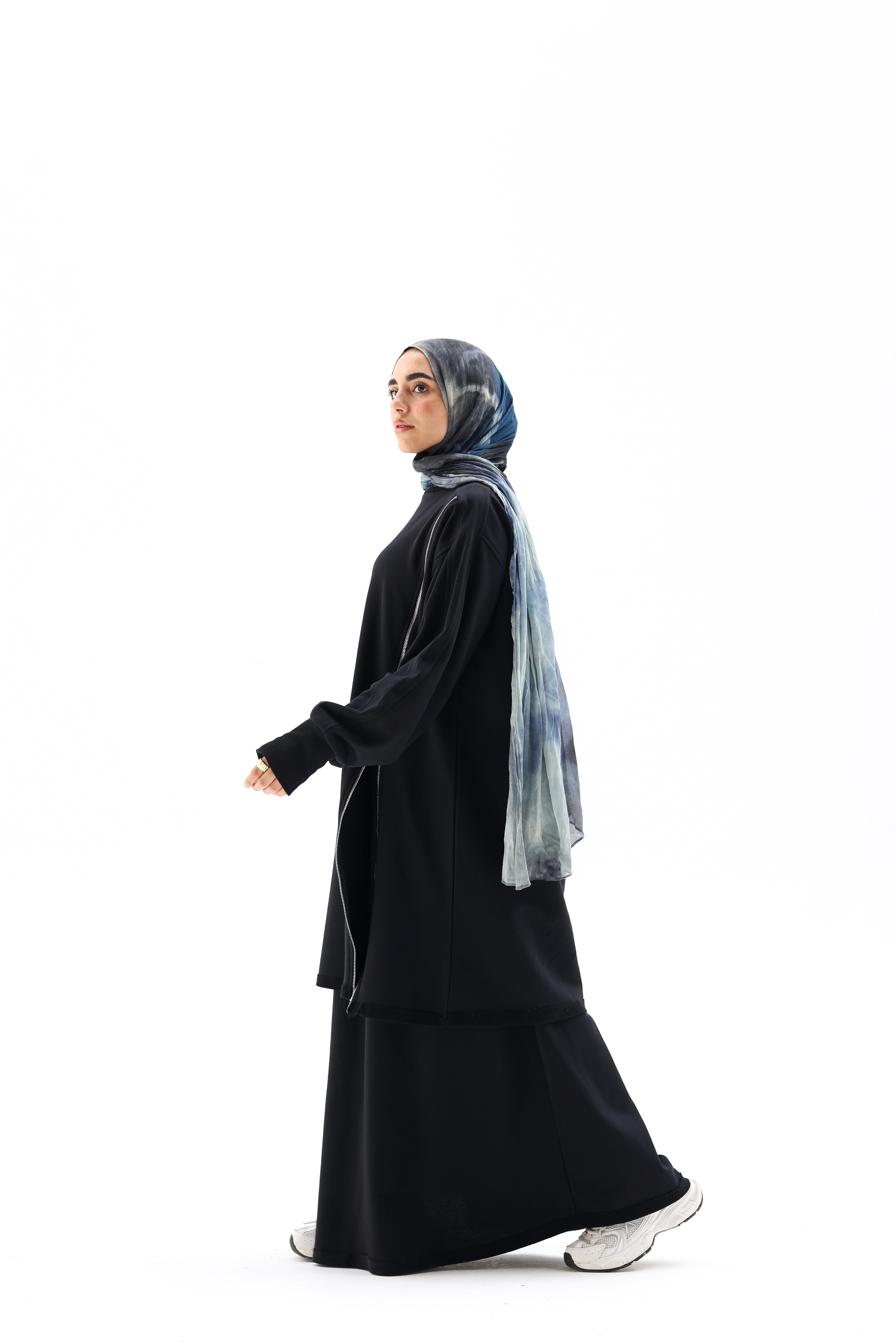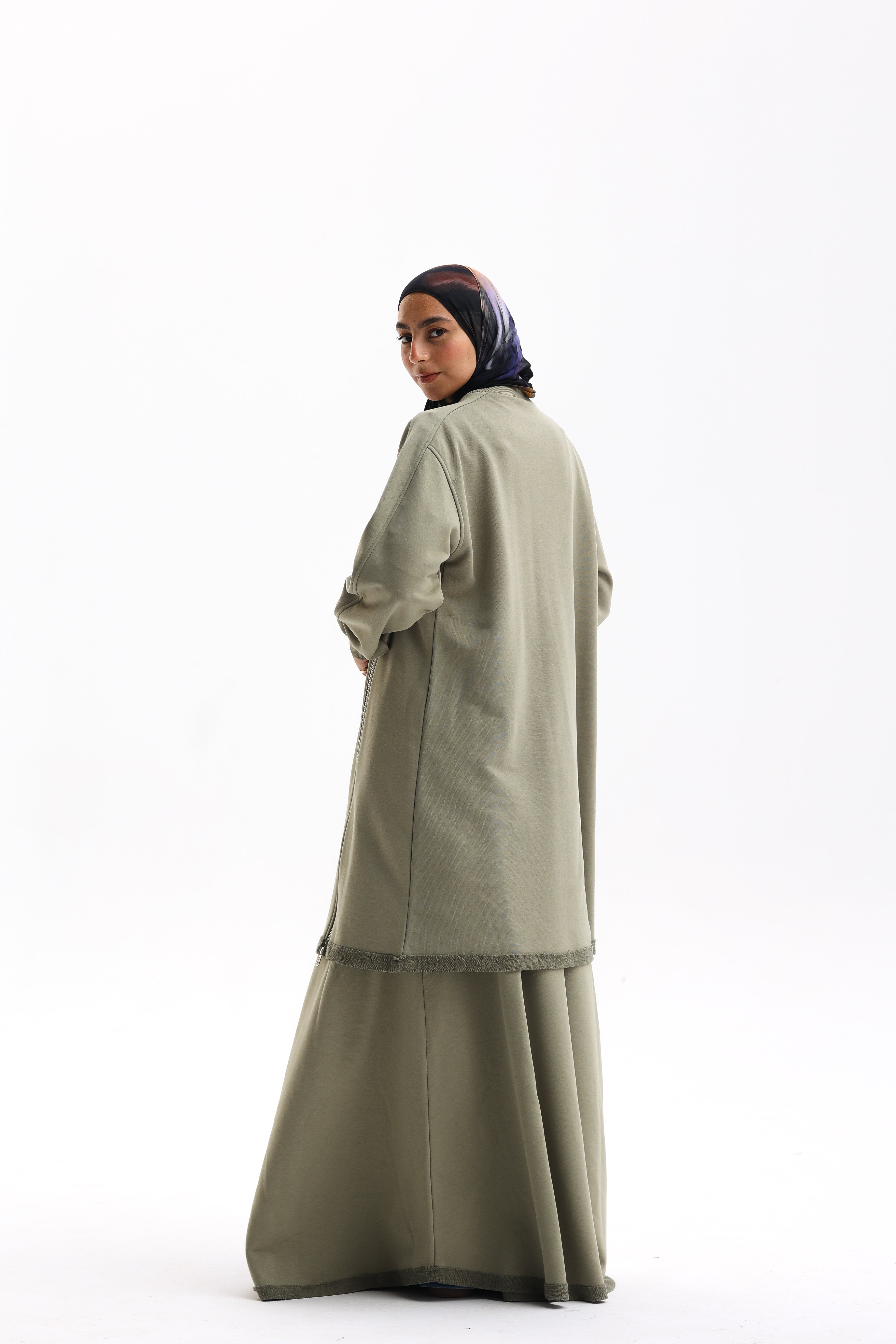 طقم شتوي مكوّن من تونيك بسوستة جانبية وجيب واسع، من خامة ميلتون ناعمة ودافئة. Two-piece winter set featuring a side-zip tunic and wide skirt in soft melton fabric.