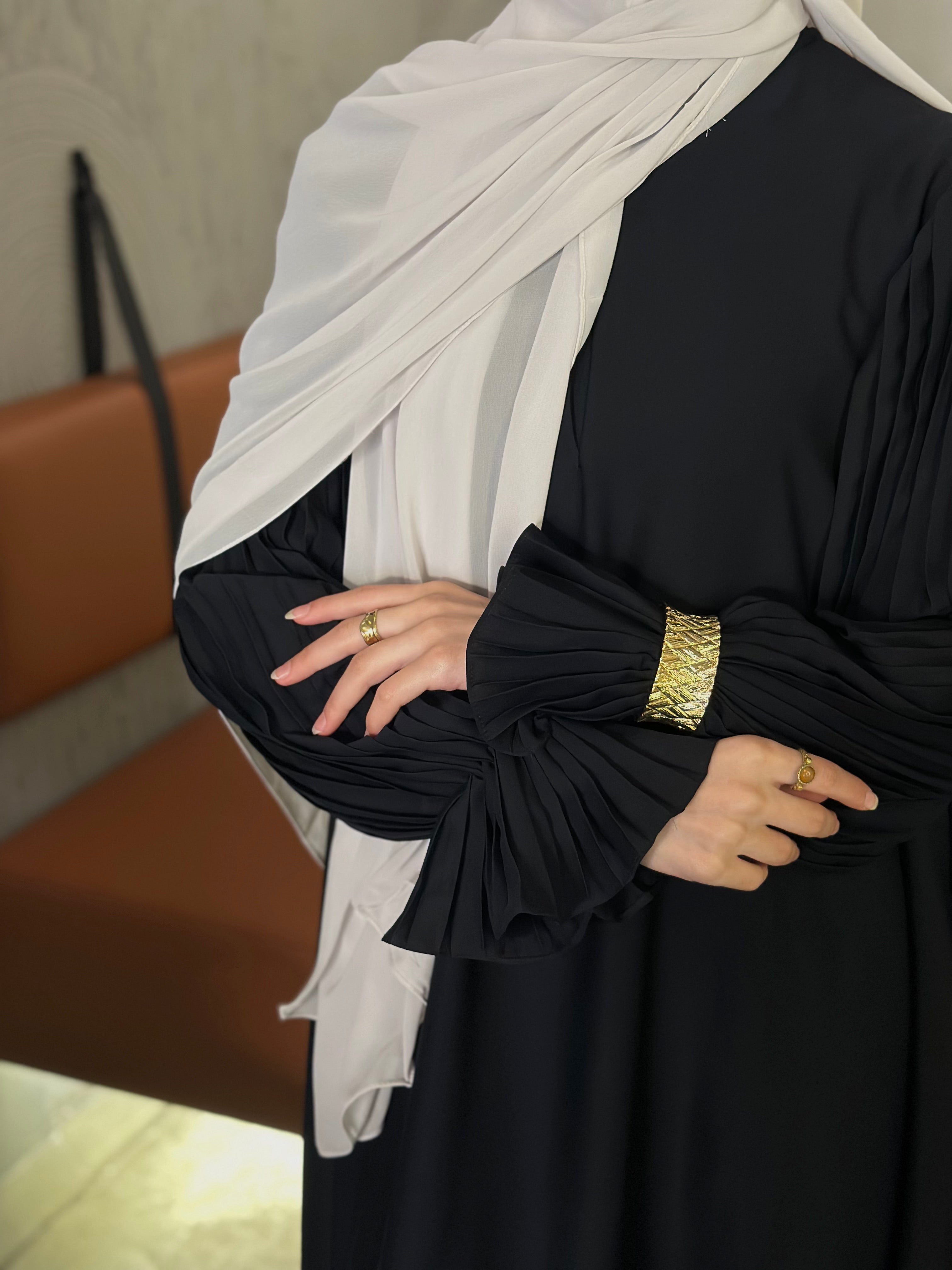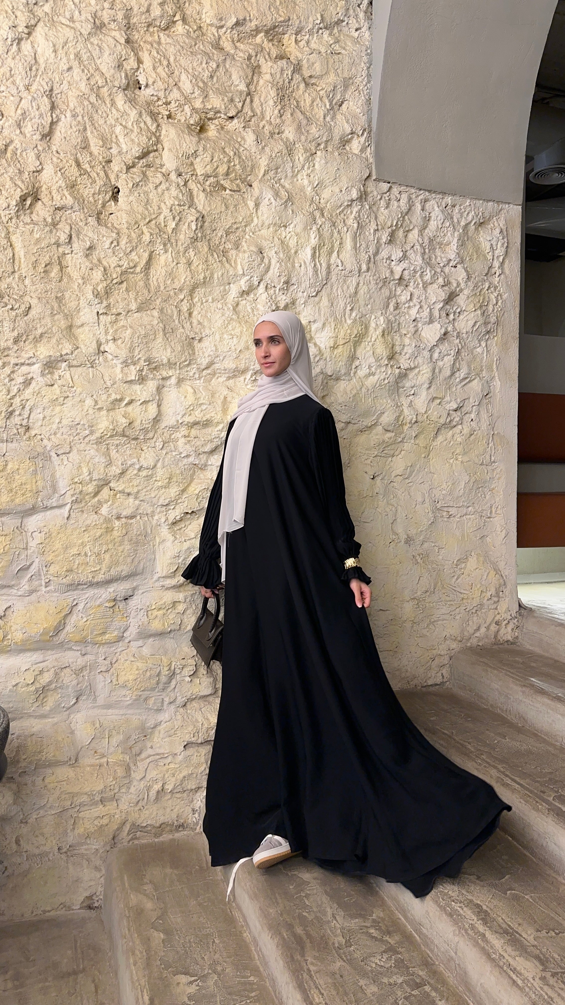Soft silk abaya with a double-cloche cut and pleated sleeves عباية من الحرير دابل كلوش وأكمام بيليسيه، تجمع بين الراحة والأناقة في إطلالة واحدة