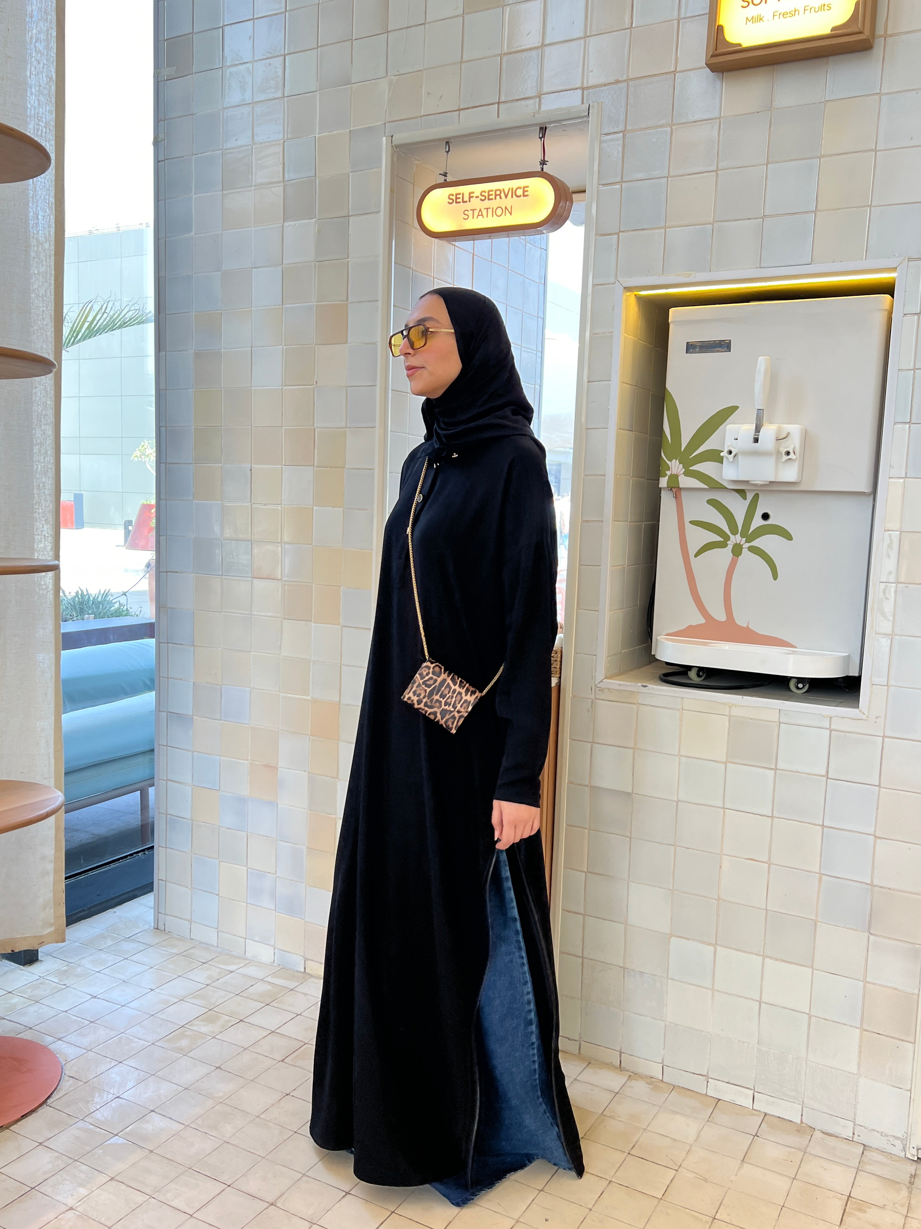 Elegant black abaya with a sleek and minimal design, featuring a soft side slit for ease of movement and a modern touch. عباية سوداء أنيقة بتصميم بسيط وانسيابي، تتميز بفتحة جانبية ناعمة تمنح راحة في الحركة وتضفي لمسة عصرية.