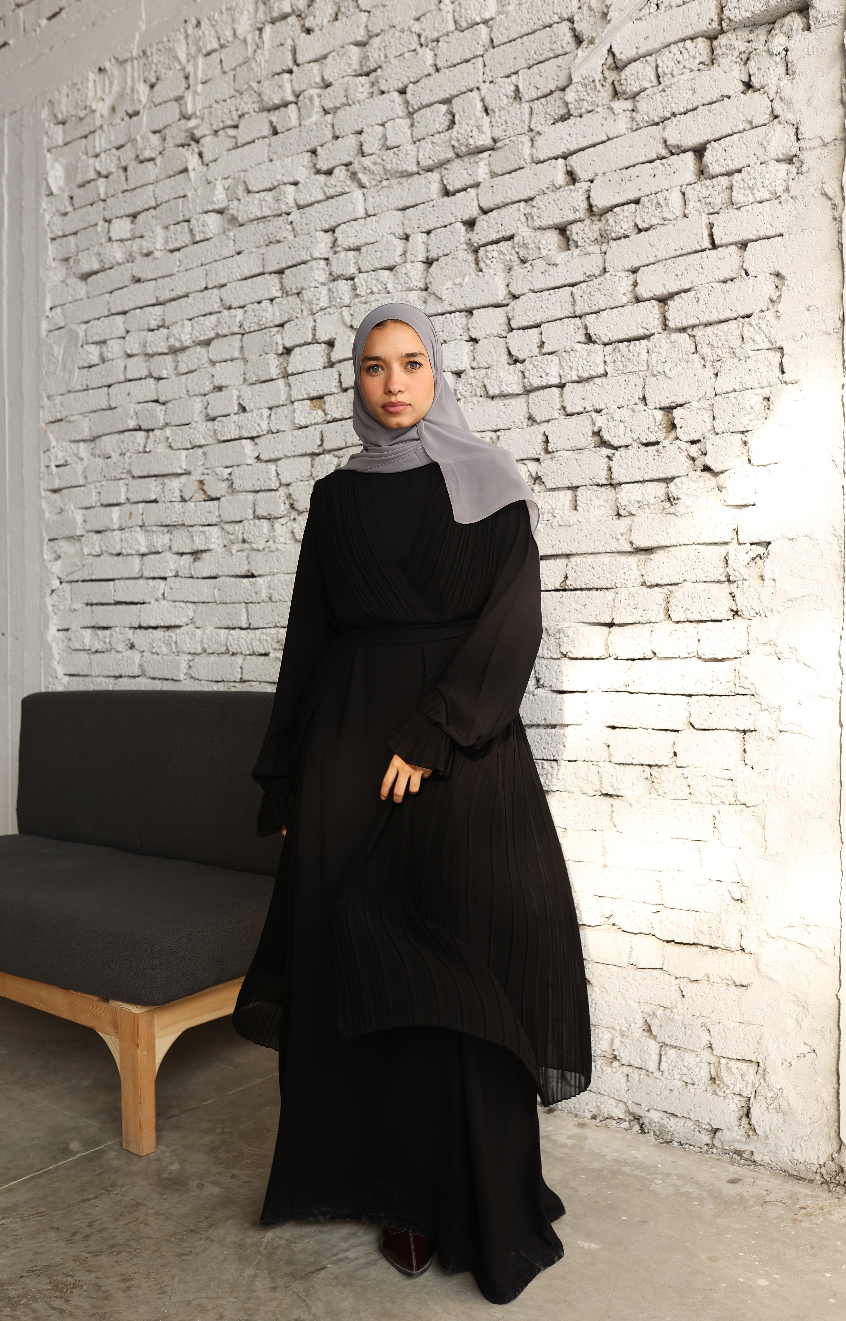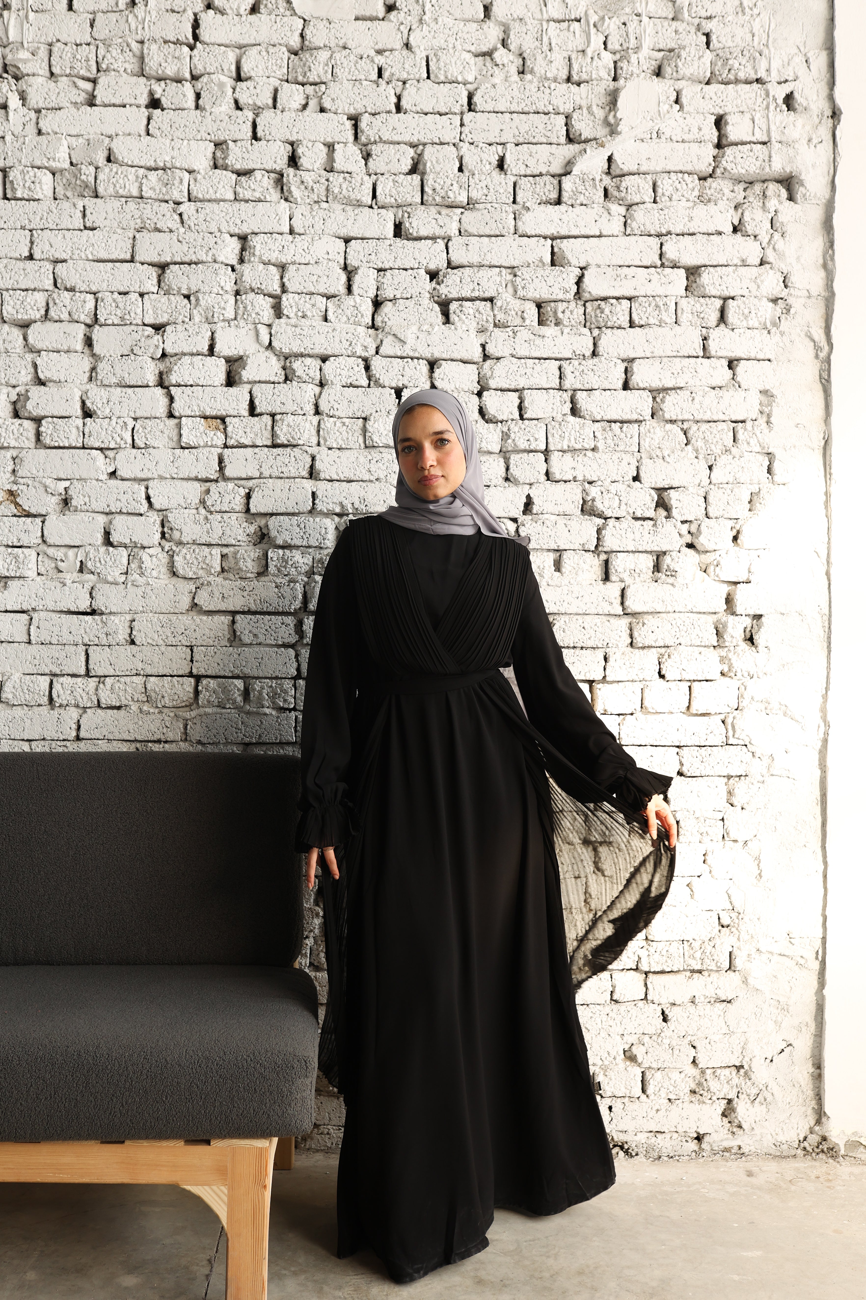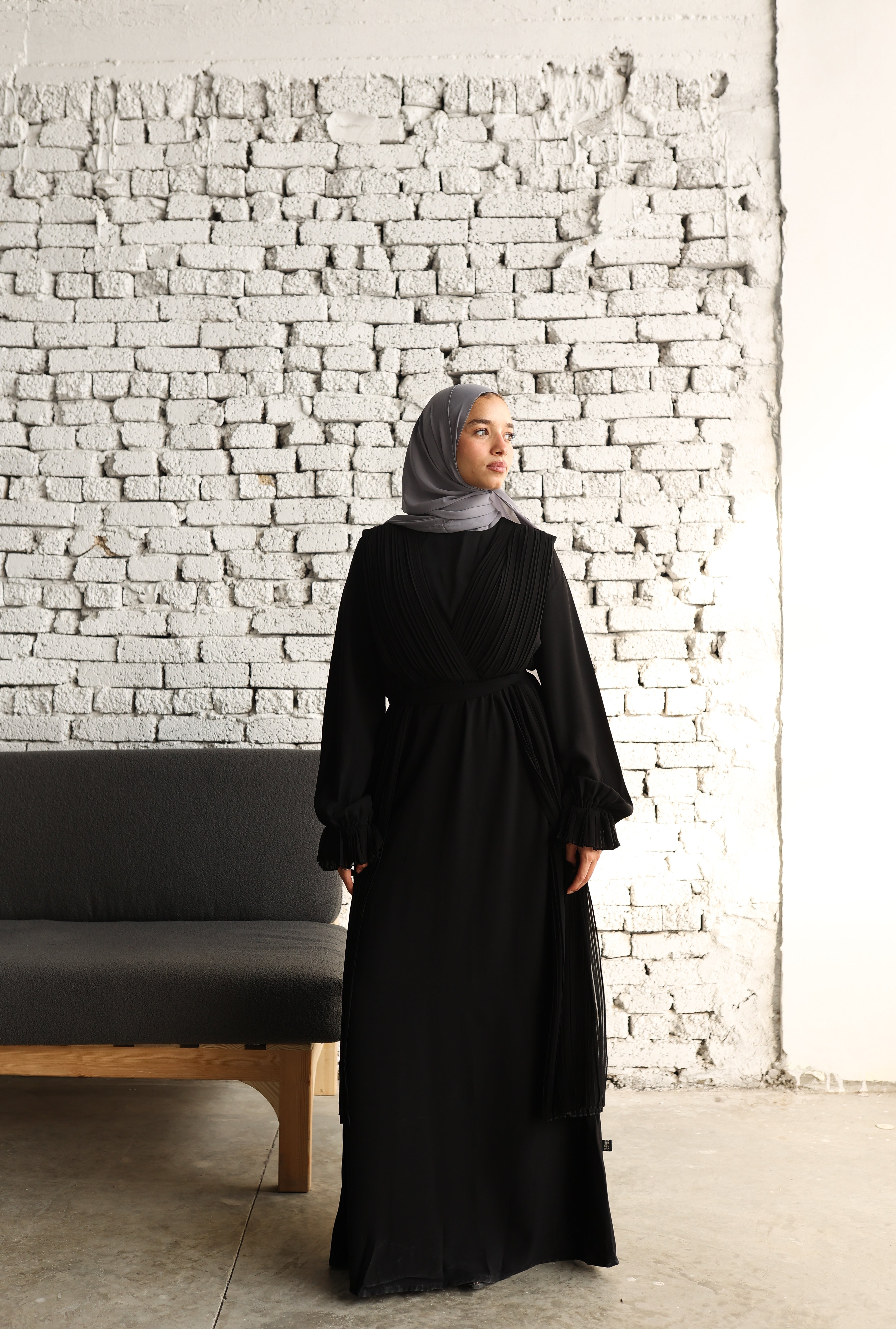 An elegant black abaya adorned with delicate pleats, offering a sophisticated and distinctive look. The wide sleeves with pleated details add a touch of luxury and grace. عباية سوداء أنيقة مزينة بثنيات دقيقة تضفي مظهراً راقياً ومميزاً. أكمامها الواسعة والمزينة بطيات تضيف لمسة من الفخامة والجمال.