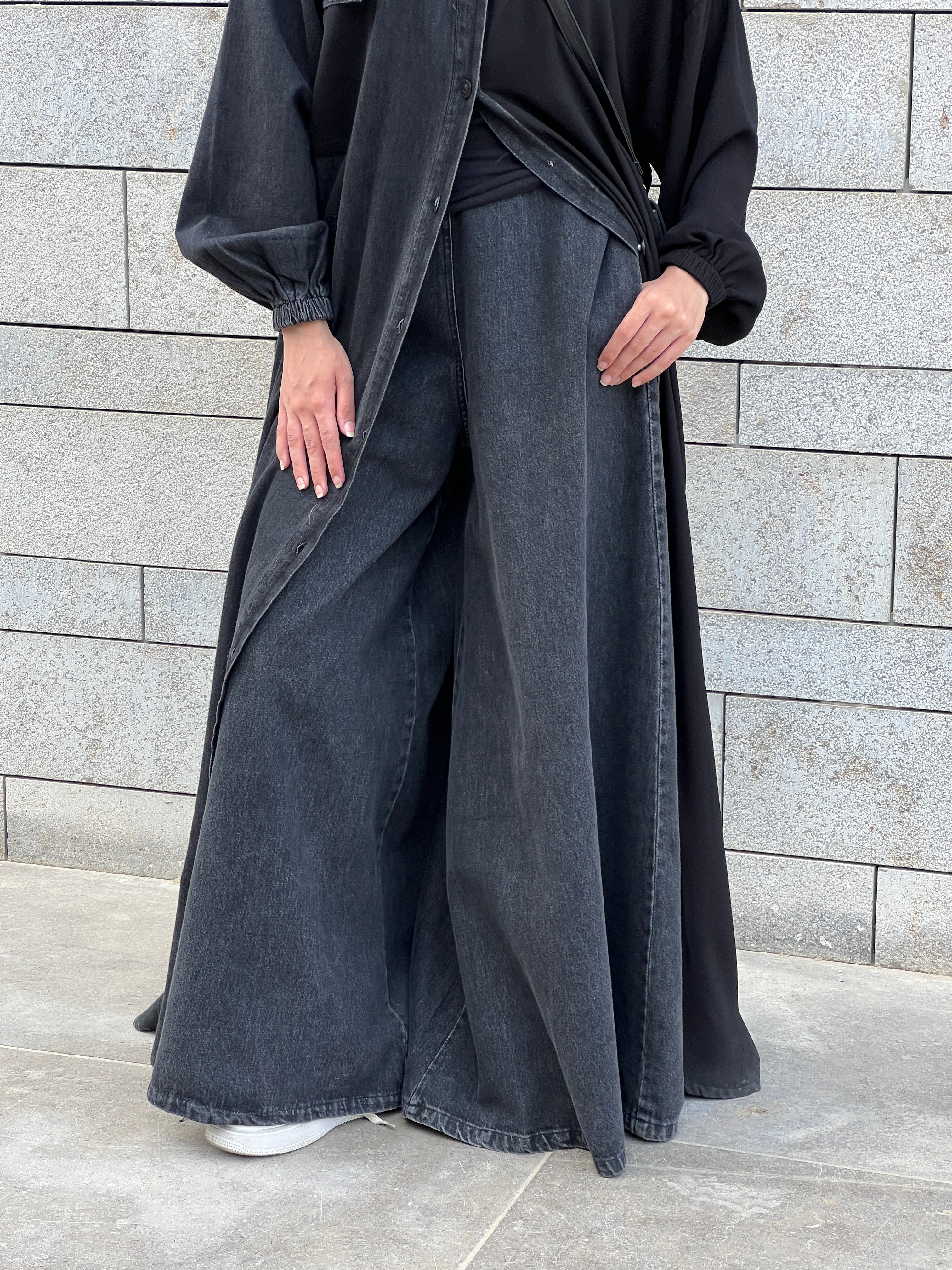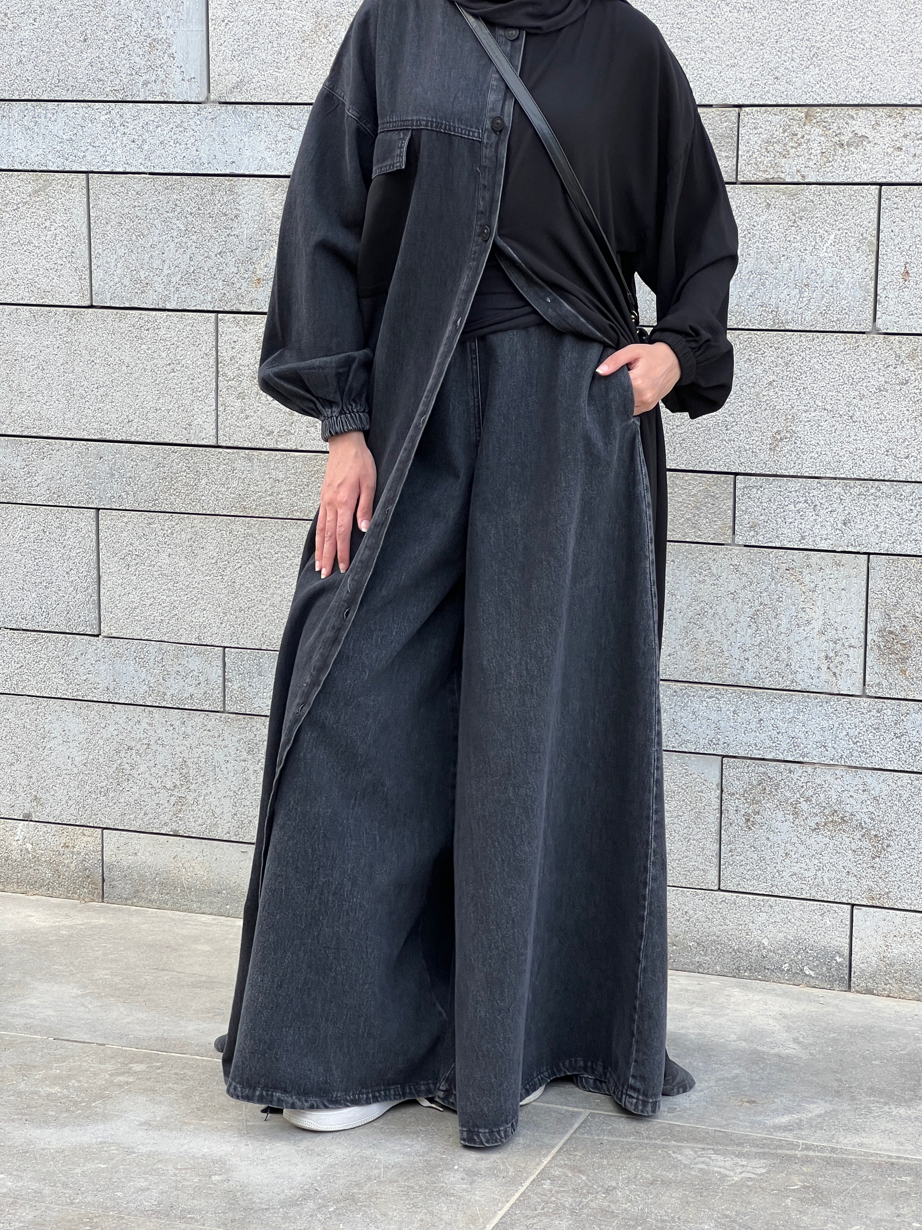 Wide-leg denim pants designed for comfort and style. A relaxed fit that flows with every step — your new everyday essential. بنطلون جينز بقصّة واسعة يجمع بين الراحة والأناقة. تصميم عملي وانسيابي يناسب إطلالاتك اليومية